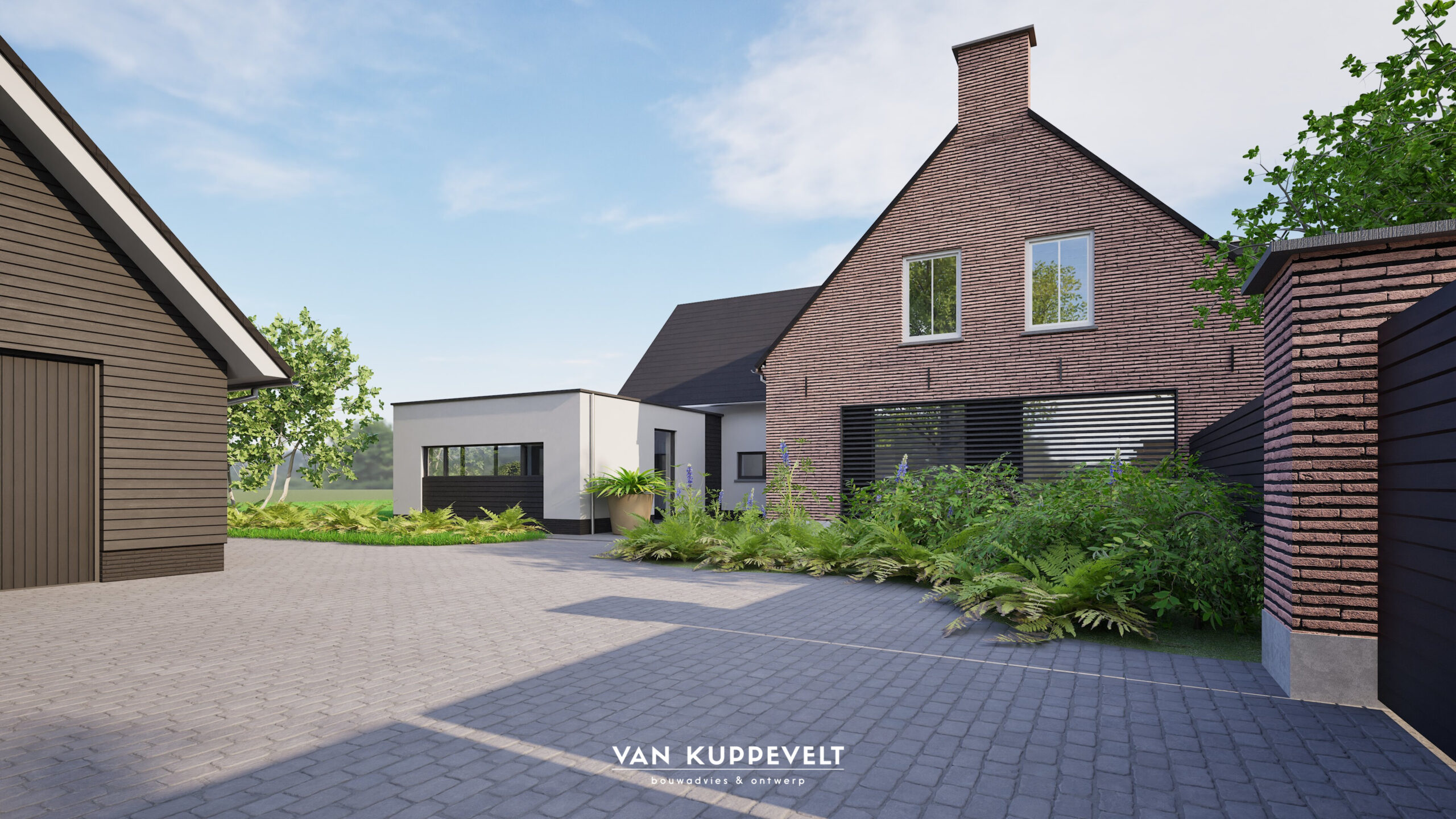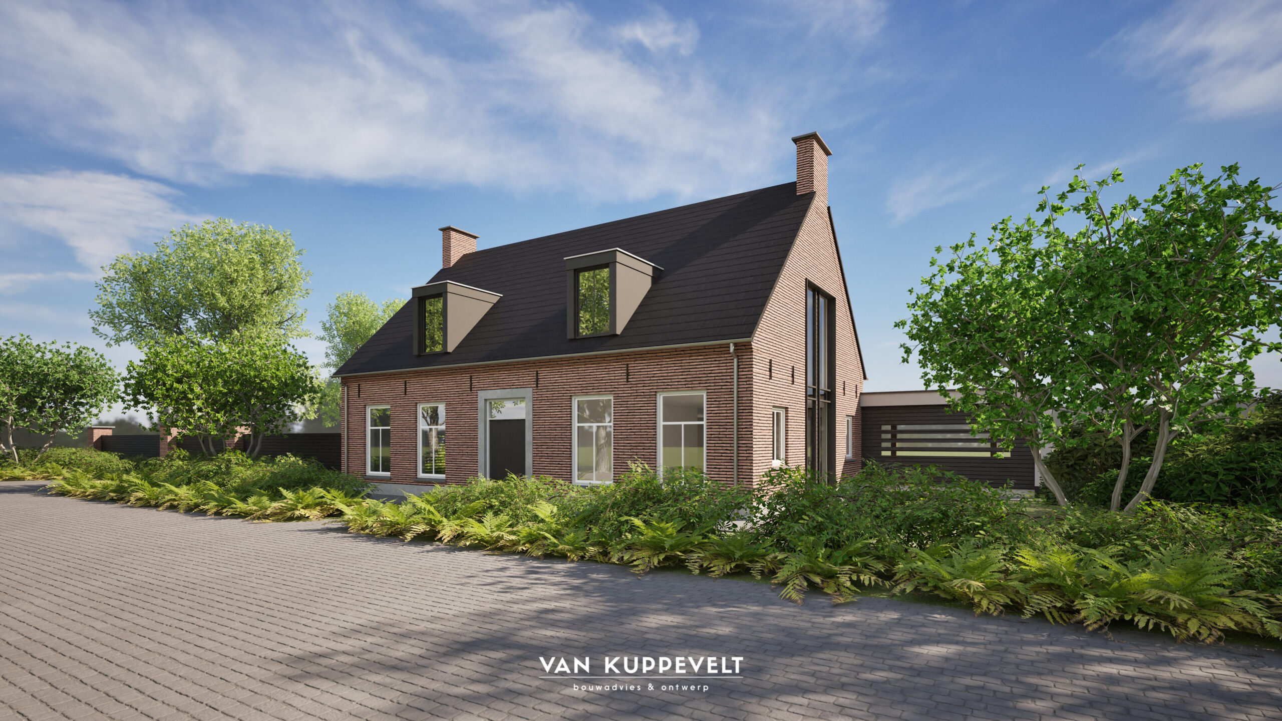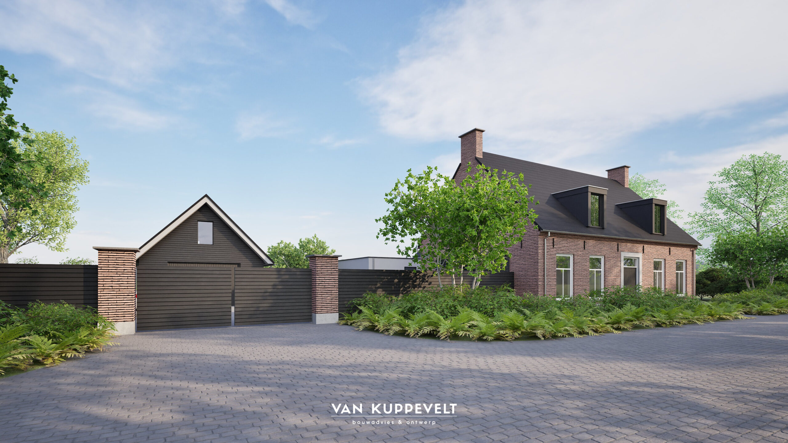 Door de sloop van agrarische bebouwing was het mogelijk om in dit agrarisch gebied een nieuwe woning te bouwen. Het is een woning met twee gezichten. De voorzijde (straatzijde) van de woning heeft een traditionele uitstraling met metselwerk gevels en een klassieke gevelindeling met bijbehorende roedeverdelingen in de kozijnen. De achterzijde van de woning is in een moderne vorm en uitstraling uitgevoerd. De kaderlijn van de overkapping koppelt optisch het lage bijgebouw, de dwarskap en de overkapping. Alle moderne bebouwing grenzend aan de gemetselde woning zijn opgetrokken in wit stucwerk. De robuuste eikenhouten kolommen zijn terug liggend geplaatst zodat het lijnenspel van kaders optimaal tot zijn recht komt. Het bijgebouw is terughoudend ontworpen met een gemetselde plint en gepotdekselde delen. Beide in een zwart-grijze kleur. Vanuit de leefgebieden op de begane grond is rekening gehouden met zichtlijnen naar zowel de straatzijde als het agrarisch achterland.