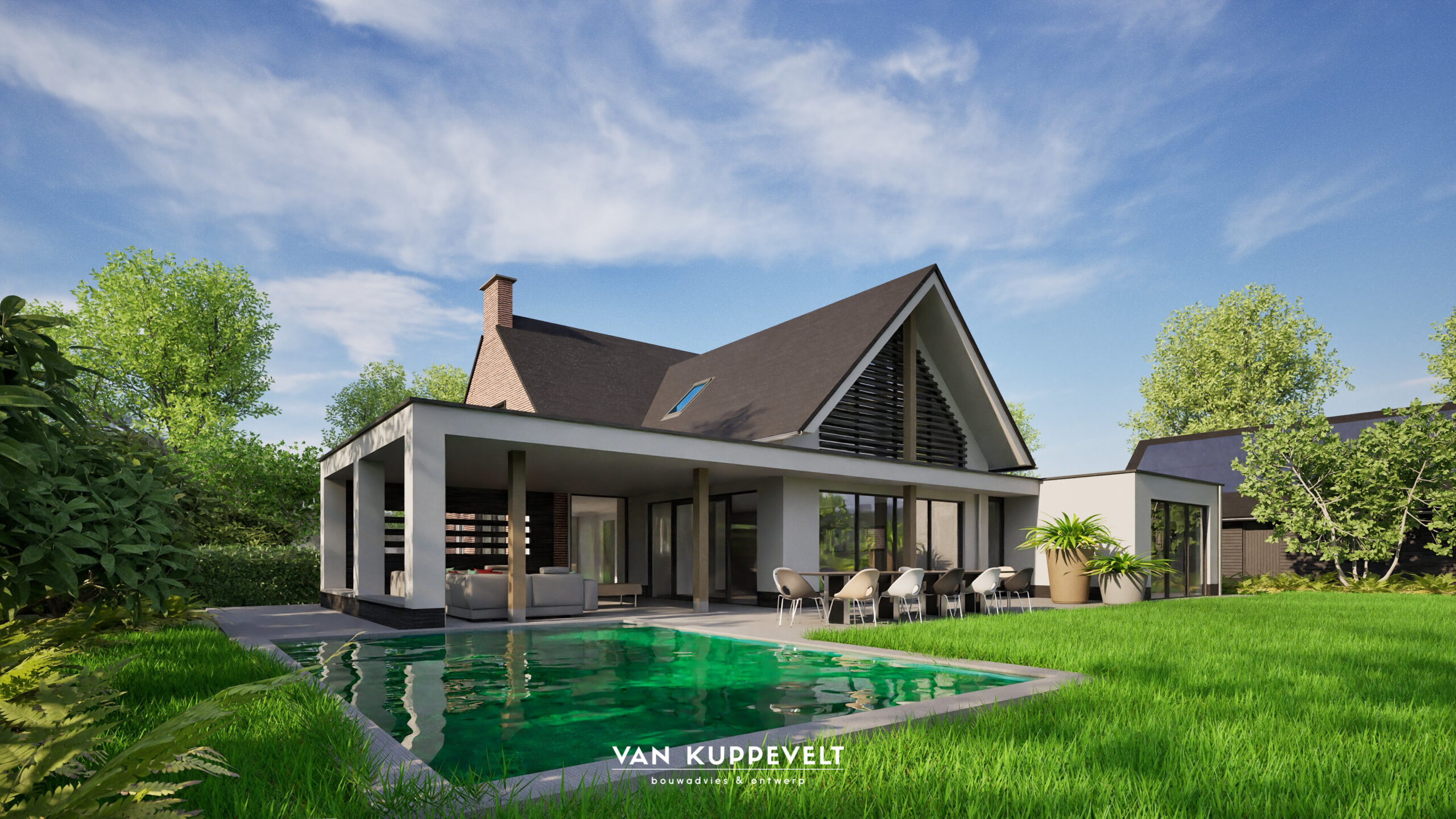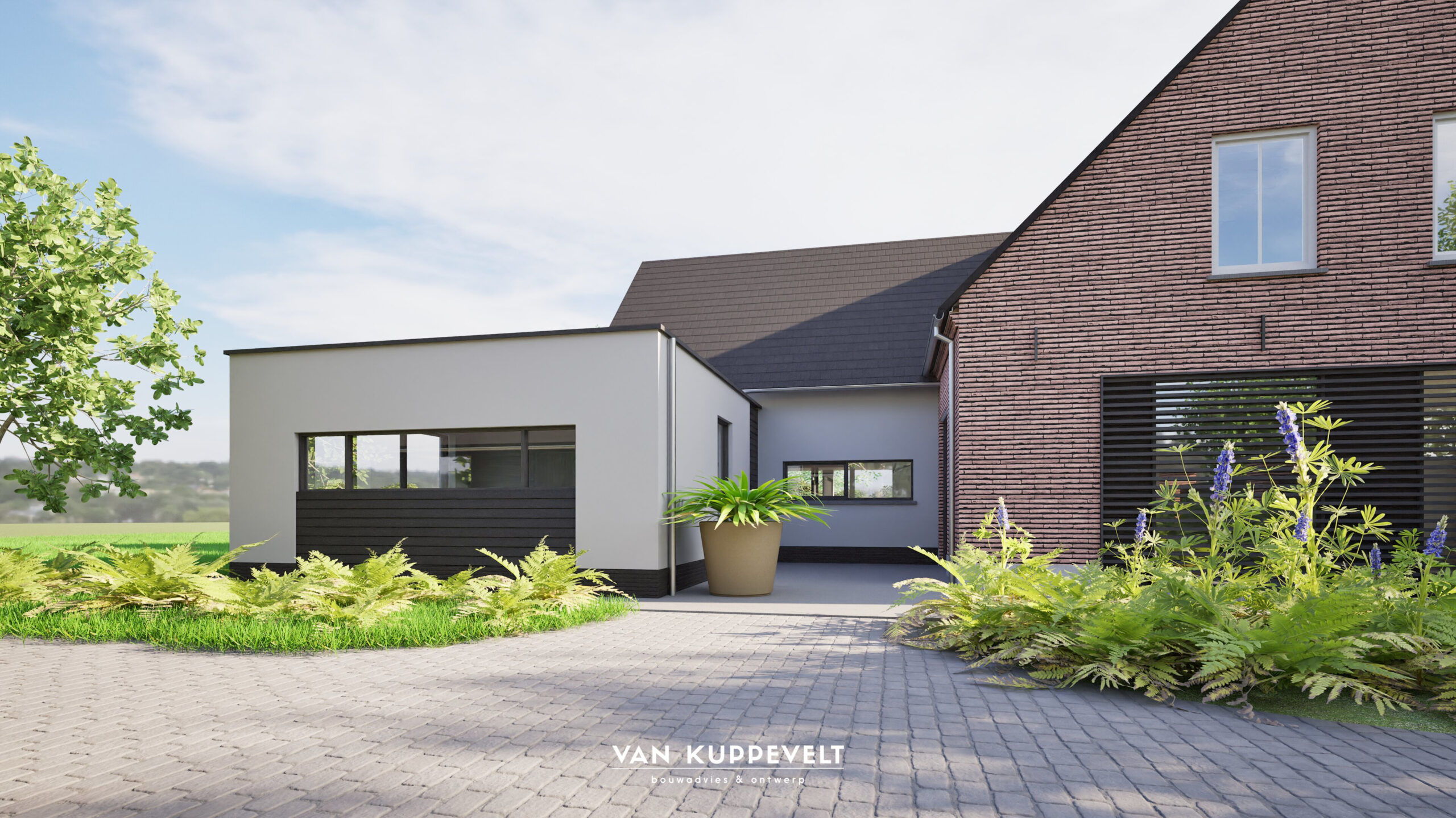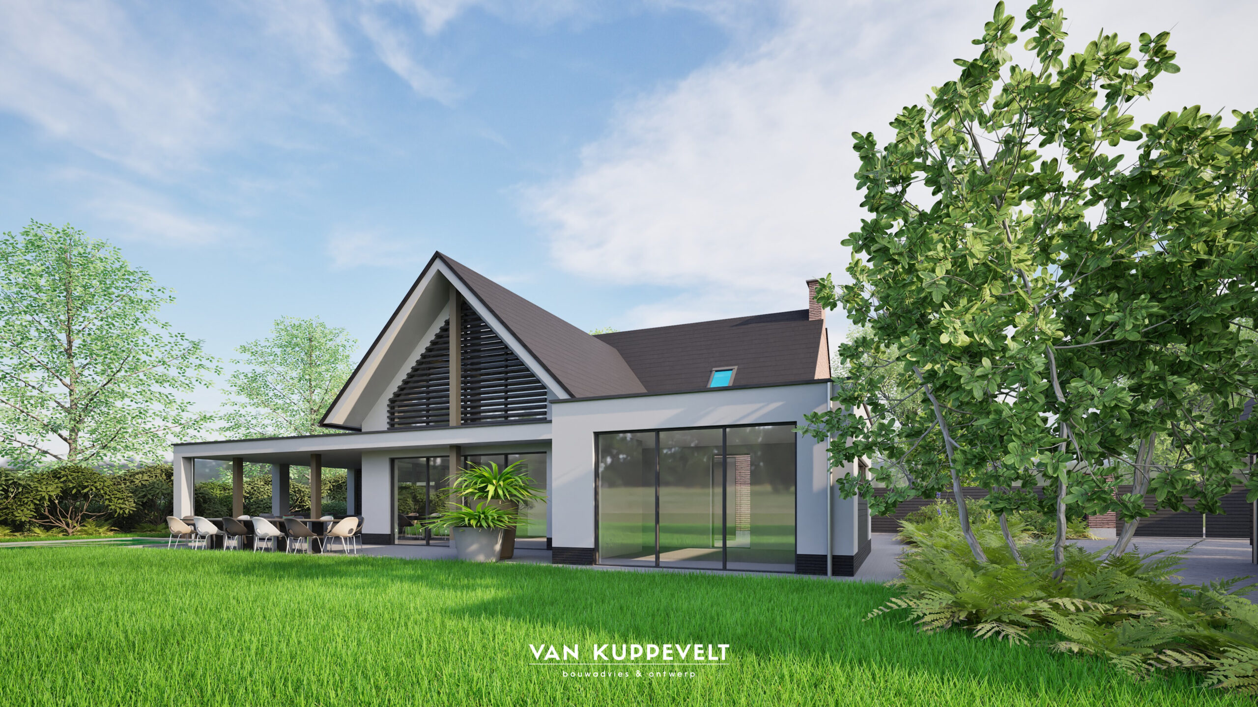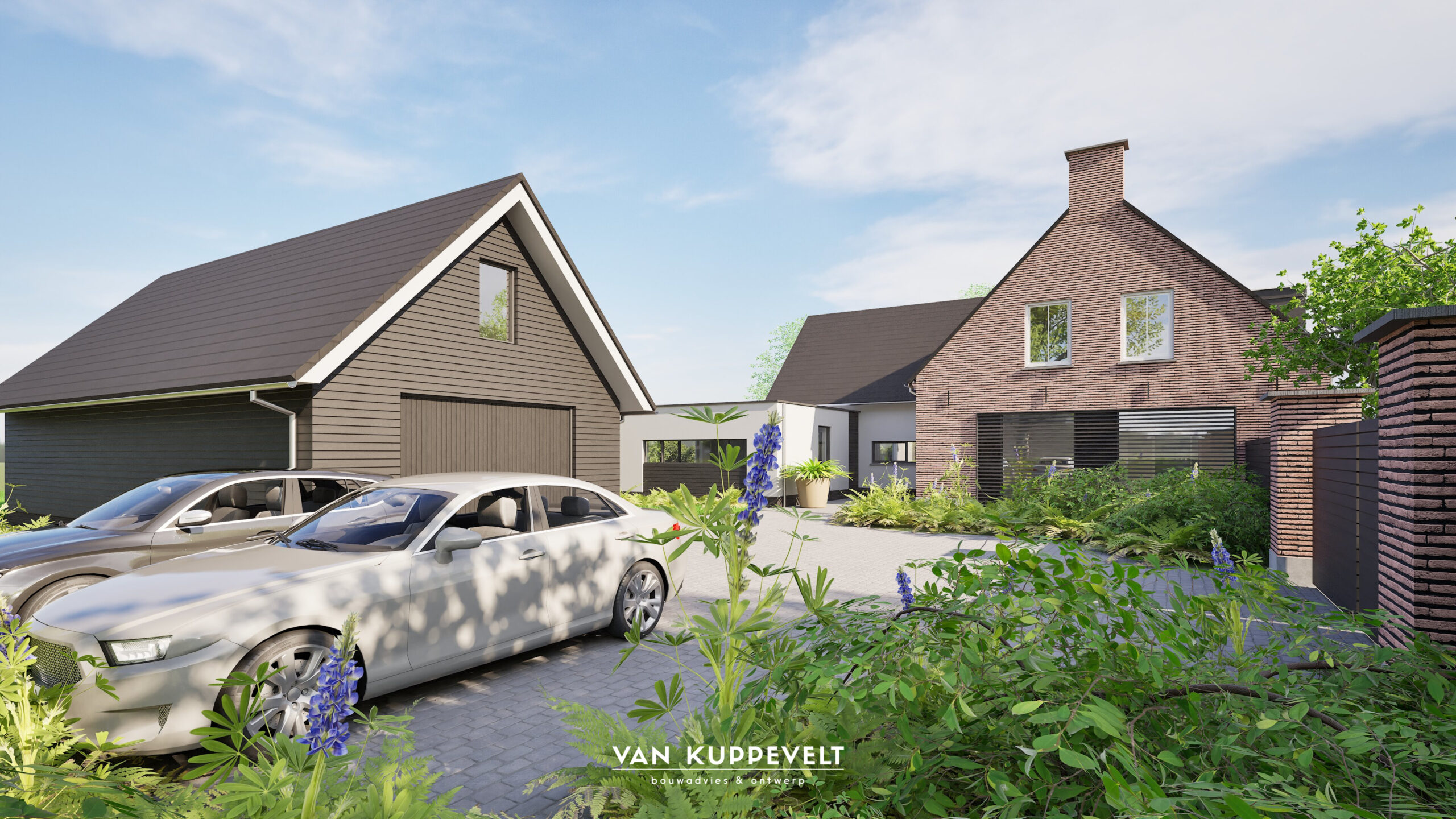 Door de sloop van agrarische bebouwing was het mogelijk om in dit agrarisch gebied een nieuwe woning te bouwen. Het is een woning met twee gezichten. De voorzijde (straatzijde) van de woning heeft een traditionele uitstraling met metselwerk gevels en een klassieke gevelindeling met bijbehorende roedeverdelingen in de kozijnen. De achterzijde van de woning is in een moderne vorm en uitstraling uitgevoerd. De kaderlijn van de overkapping koppelt optisch het lage bijgebouw, de dwarskap en de overkapping. Alle moderne bebouwing grenzend aan de gemetselde woning zijn opgetrokken in wit stucwerk. De robuuste eikenhouten kolommen zijn terug liggend geplaatst zodat het lijnenspel van kaders optimaal tot zijn recht komt. Het bijgebouw is terughoudend ontworpen met een gemetselde plint en gepotdekselde delen. Beide in een zwart-grijze kleur. Vanuit de leefgebieden op de begane grond is rekening gehouden met zichtlijnen naar zowel de straatzijde als het agrarisch achterland.