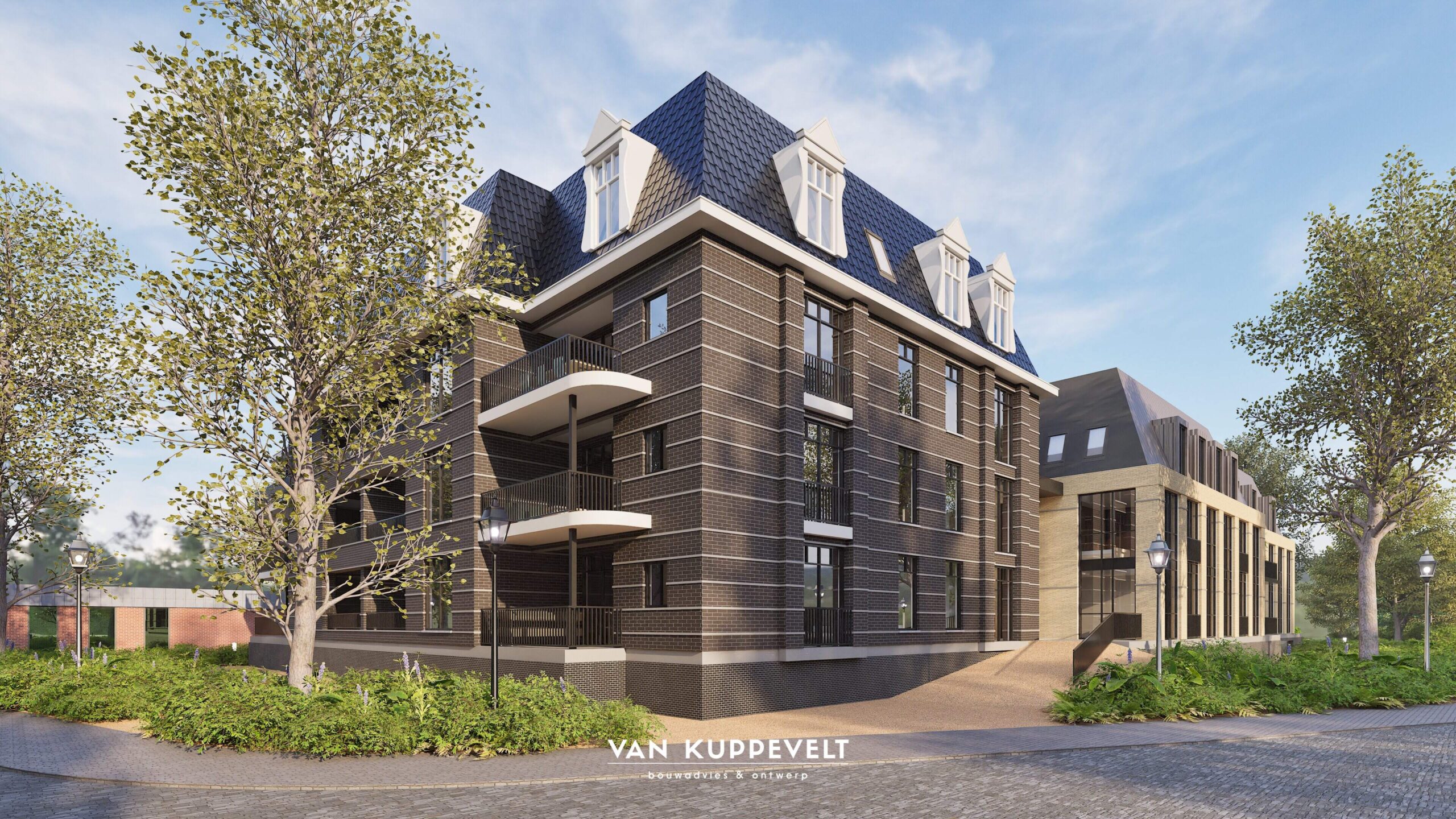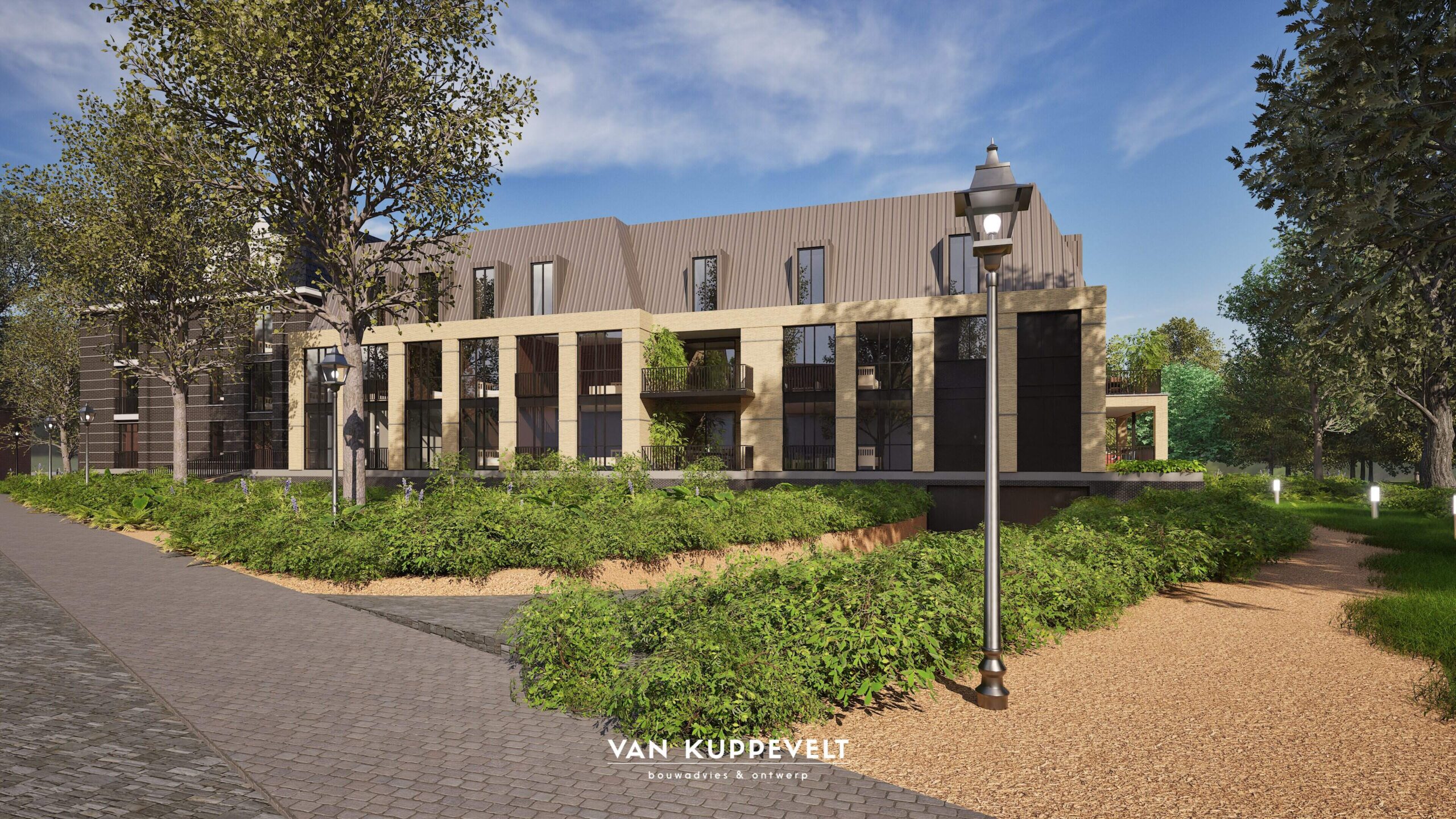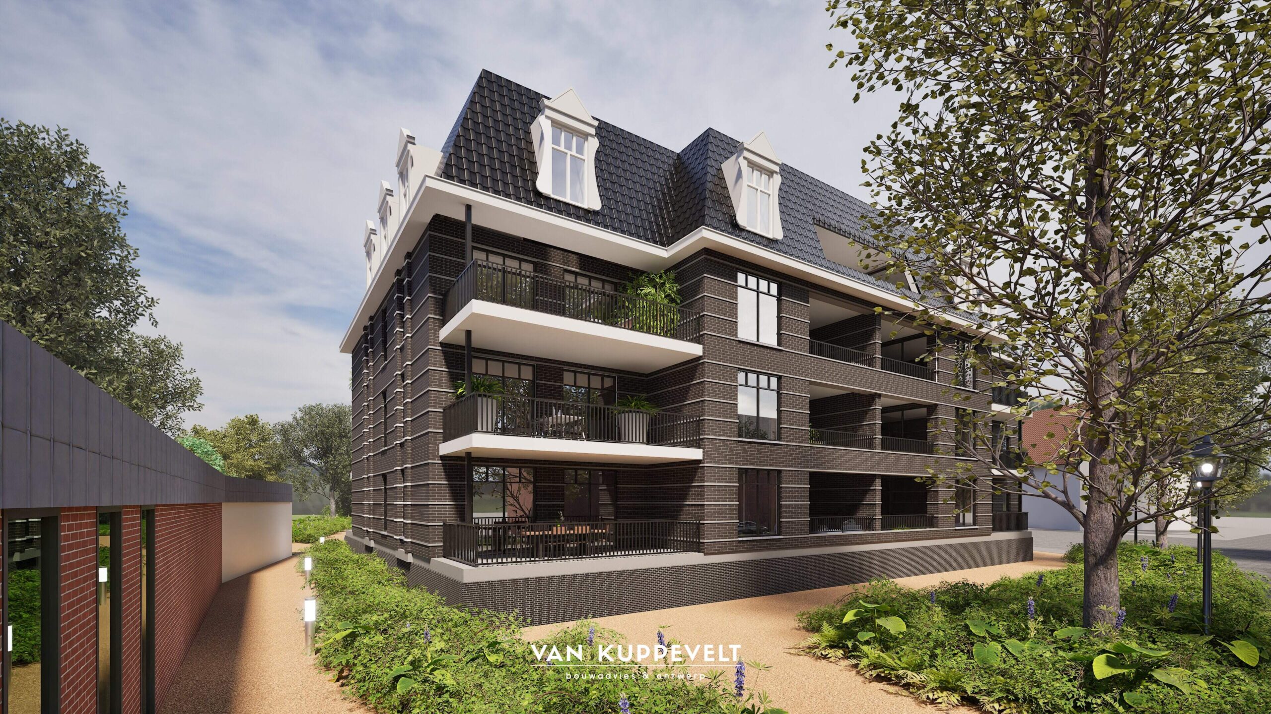 In het hart van Groesbeek hebben we een nieuw appartementengebouw ontworpen met ondergelegen parkeerkelder. Het gebouw bestaat uit twee entiteiten. Een hoofdmassa aan de zijde van de Dorpsstraat in een donkere kleurstelling en een horizontaal lijnenspel met donkergrijze spekbanden. Kenmerkend zijn de grote dakkapellen en grote balkons. Het gebouwdeel aan de zijde van de Burgemeester Ottenhoffstraat is strak in vormgeving en opgetrokken in een geel-kleurige baksteen. Het dak is uitgevoerd als zinken roevendak met geïntegreerde dakkapellen. Het gebouw wordt straks omgeven door een park-achtige landschapsinrichting.