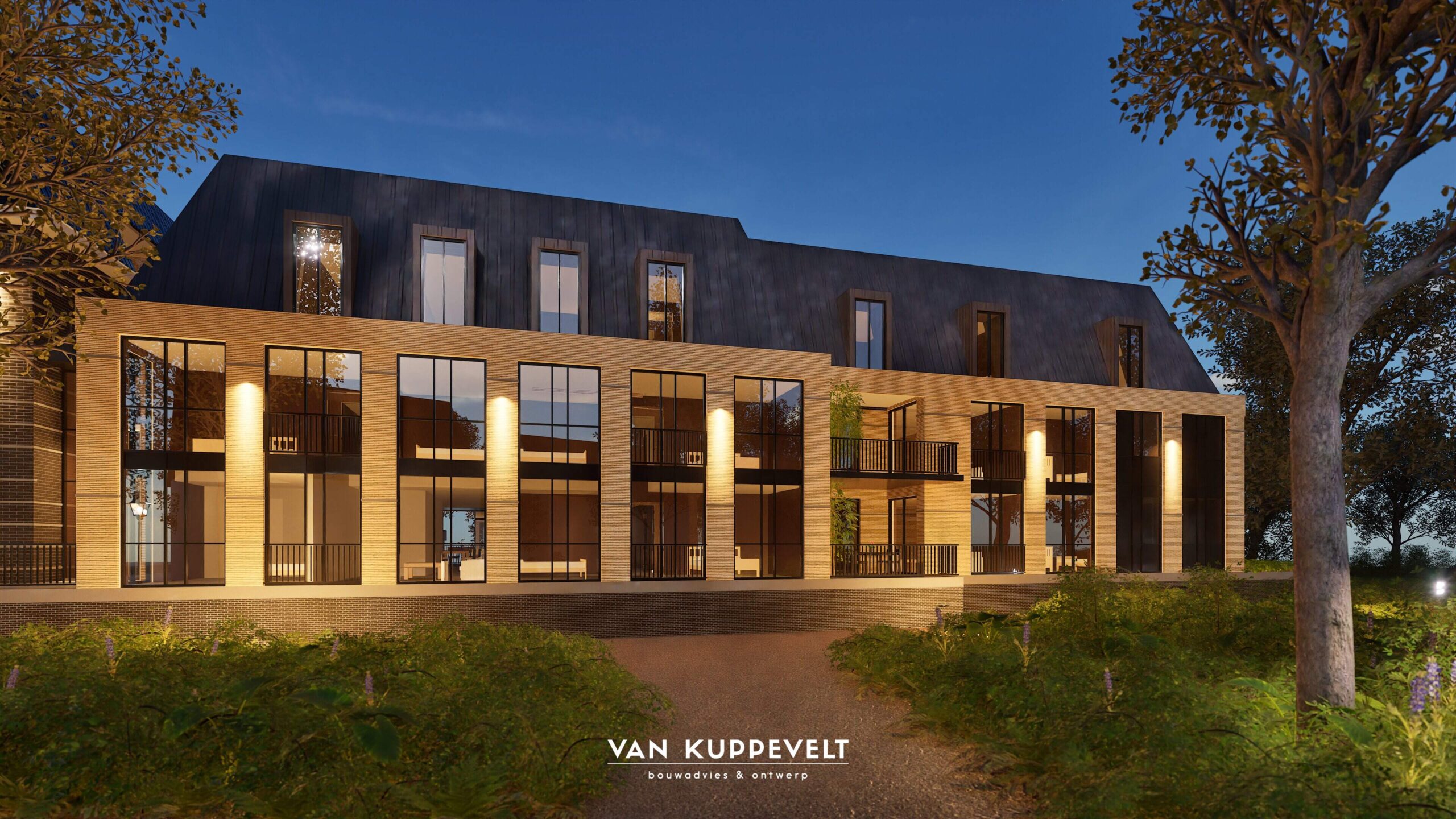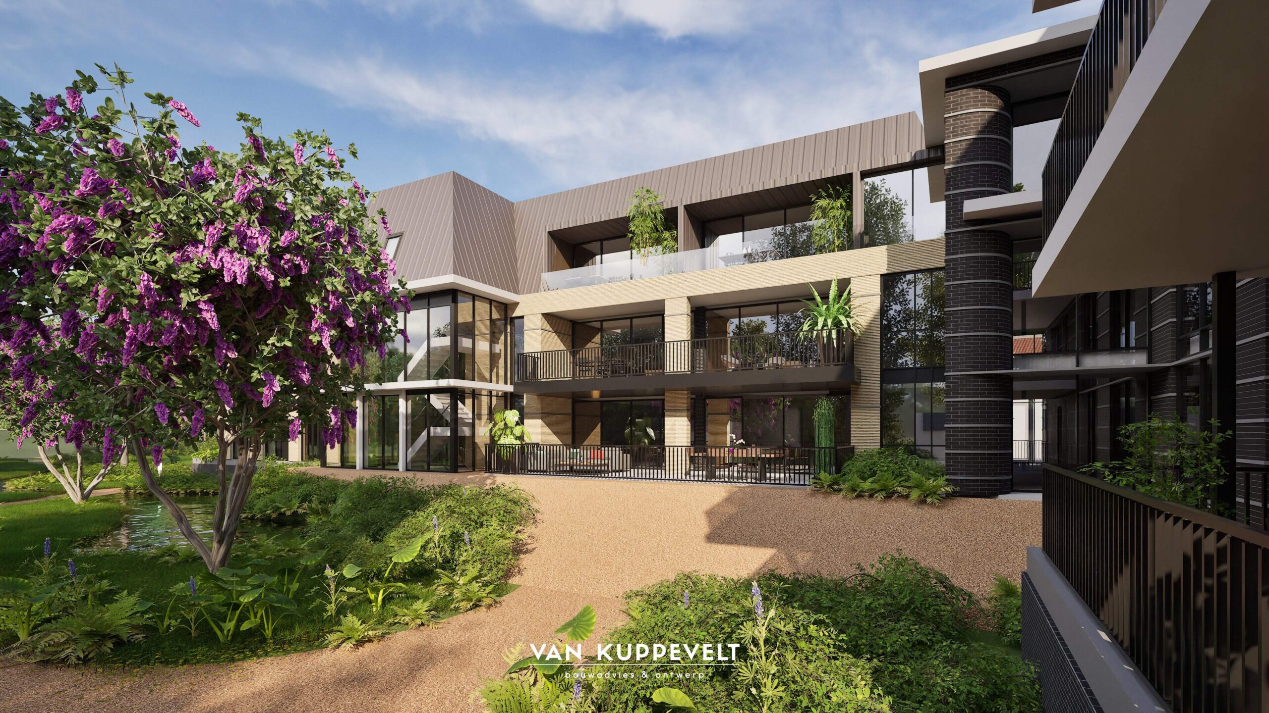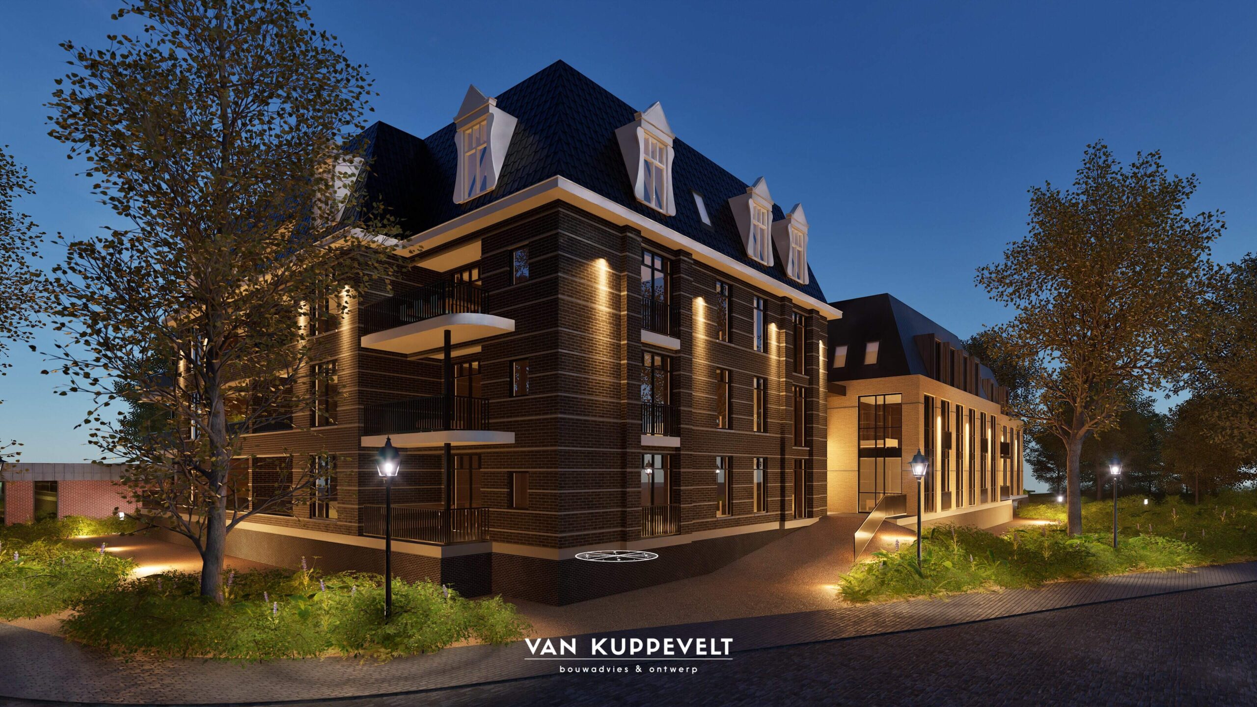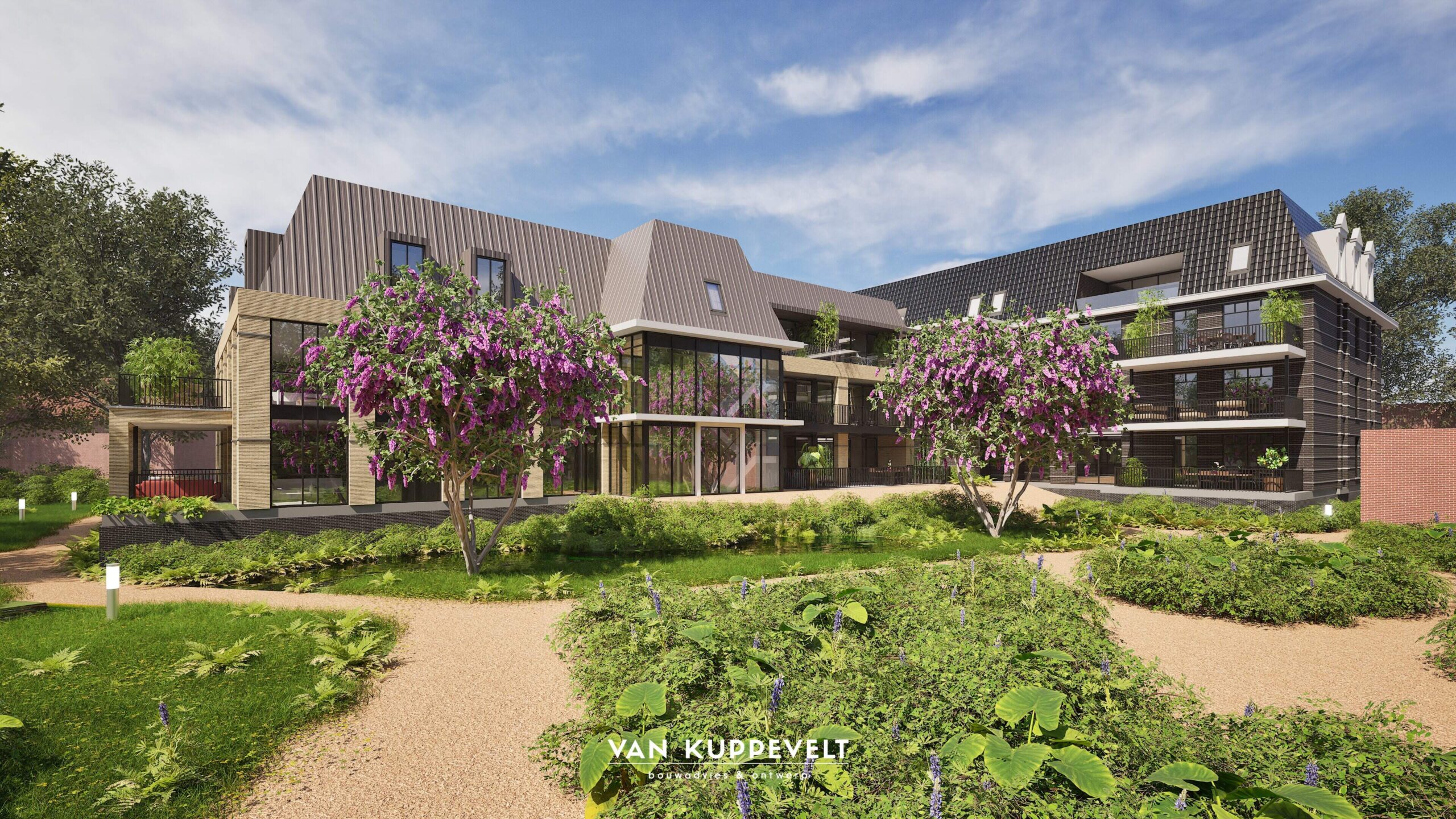 In het hart van Groesbeek hebben we een nieuw appartementengebouw ontworpen met ondergelegen parkeerkelder. Het gebouw bestaat uit twee entiteiten. Een hoofdmassa aan de zijde van de Dorpsstraat in een donkere kleurstelling en een horizontaal lijnenspel met donkergrijze spekbanden. Kenmerkend zijn de grote dakkapellen en grote balkons. Het gebouwdeel aan de zijde van de Burgemeester Ottenhoffstraat is strak in vormgeving en opgetrokken in een geel-kleurige baksteen. Het dak is uitgevoerd als zinken roevendak met geïntegreerde dakkapellen. Het gebouw wordt straks omgeven door een park-achtige landschapsinrichting.