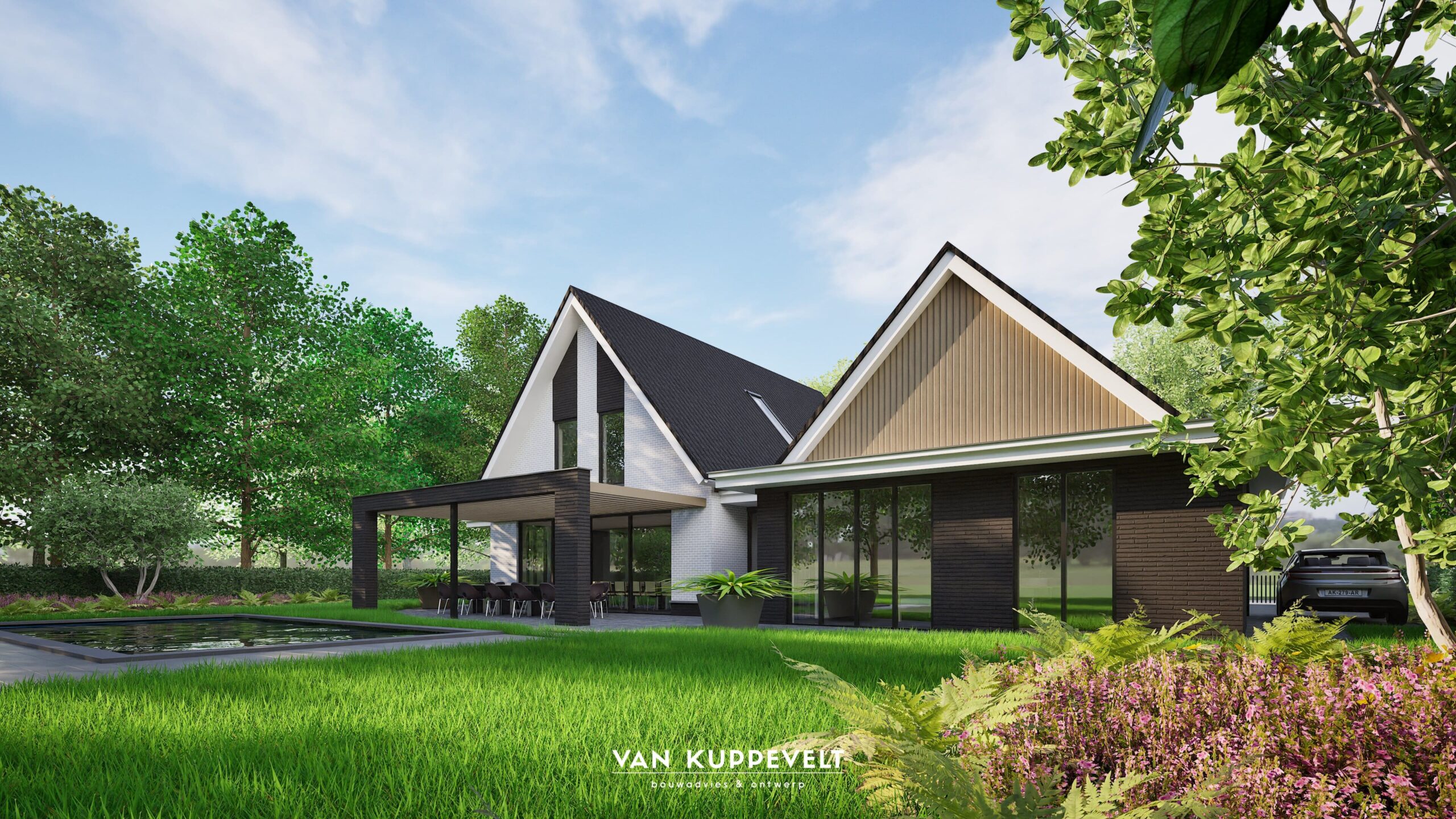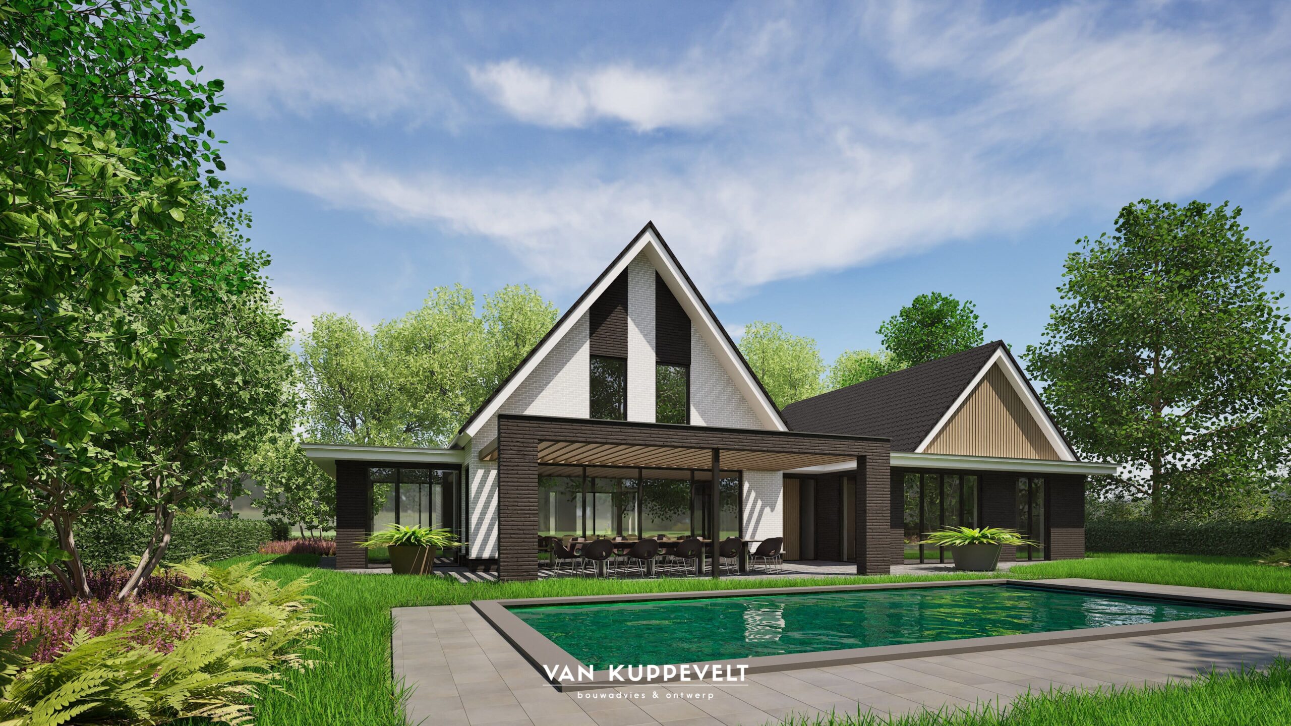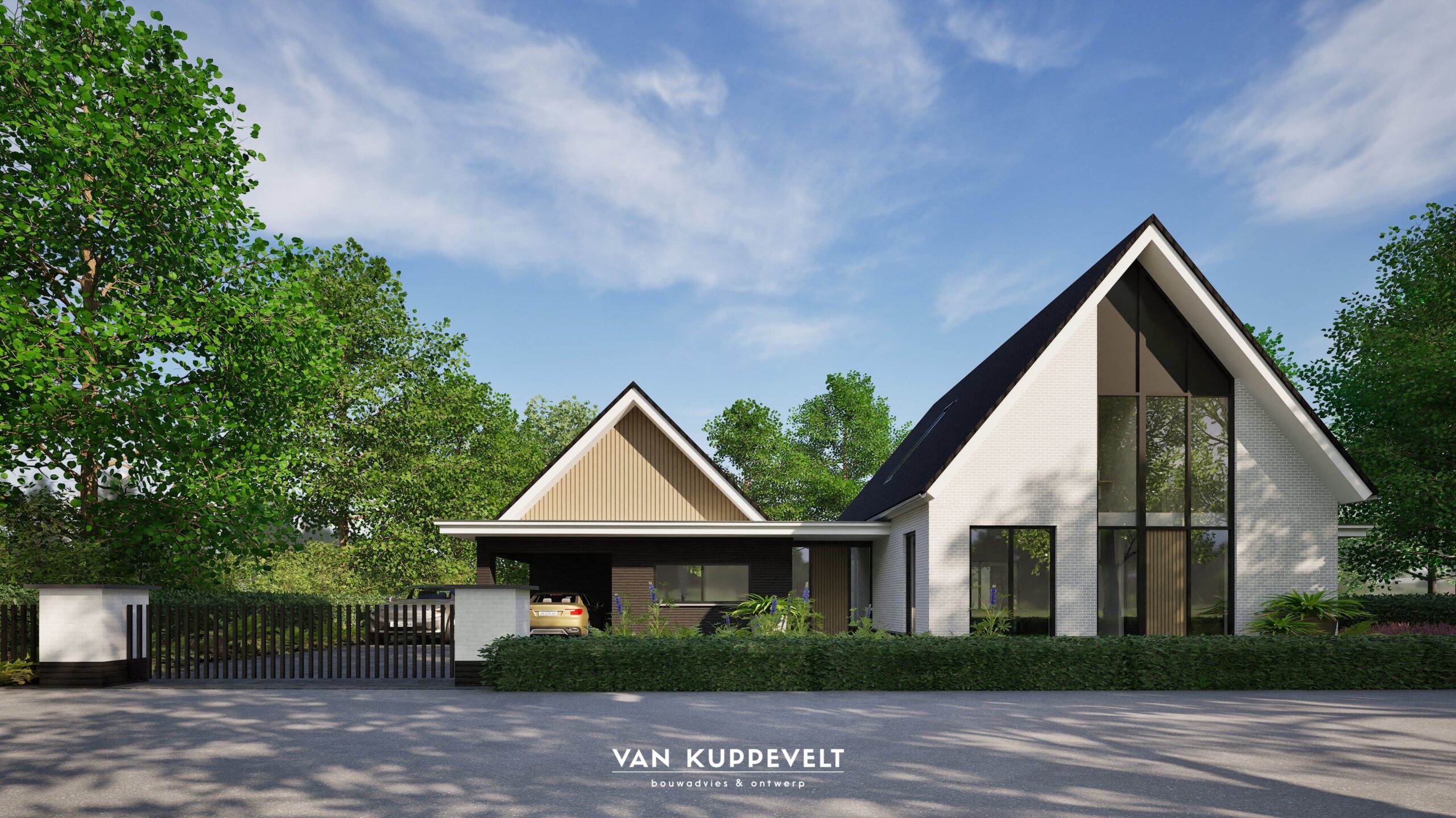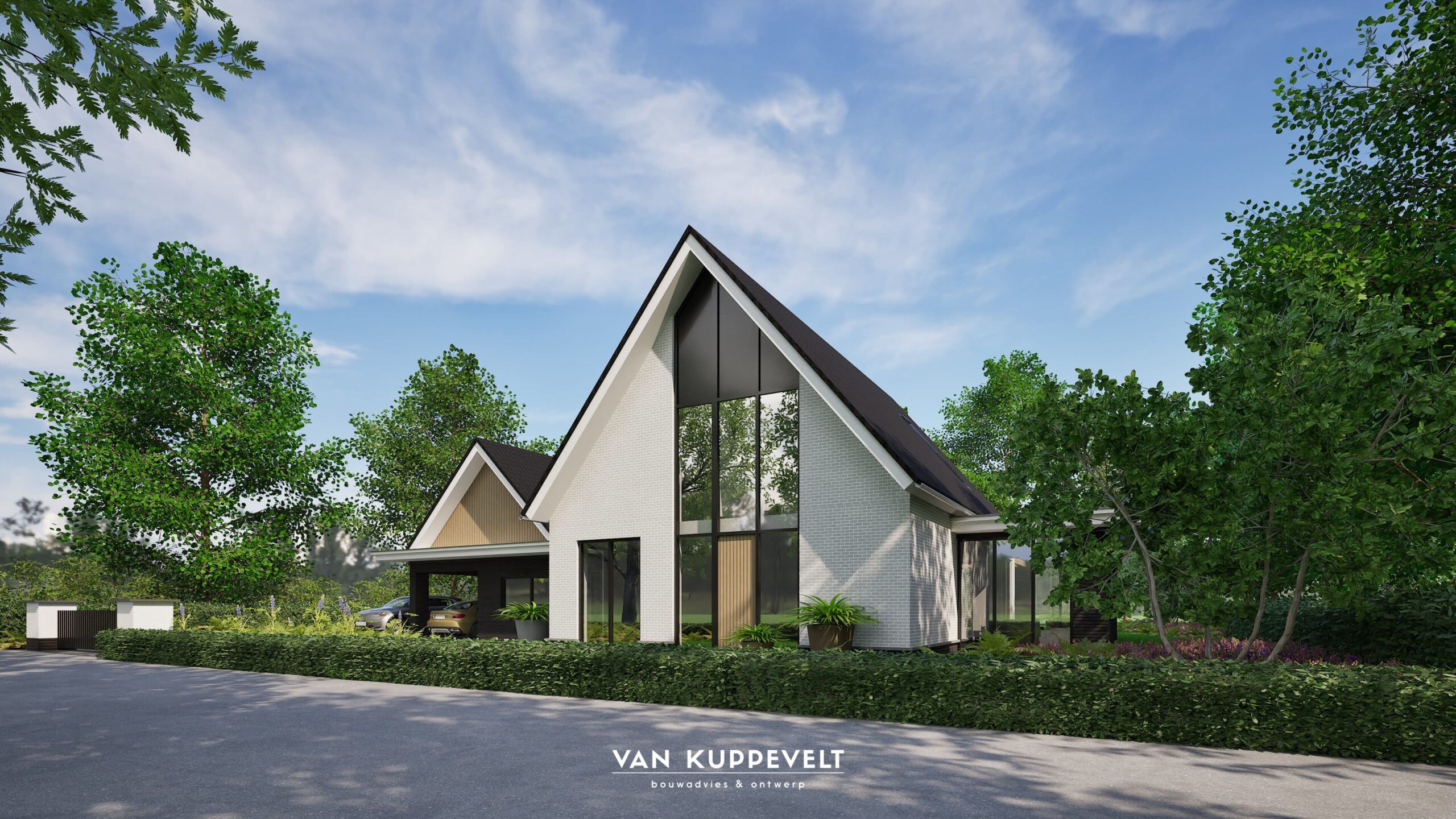 Deze moderne villa wordt gerealiseerd in het buitengebied van Groesbeek. De woning heeft een strakke belijning met een speelse vormgeving. Het bijgebouw met een kap is ingekapseld in het platte dak van het tussenlid en carport. De achterzijde van de woning is voorzien van veel glas met uitzicht op de weilanden en het zwembad.