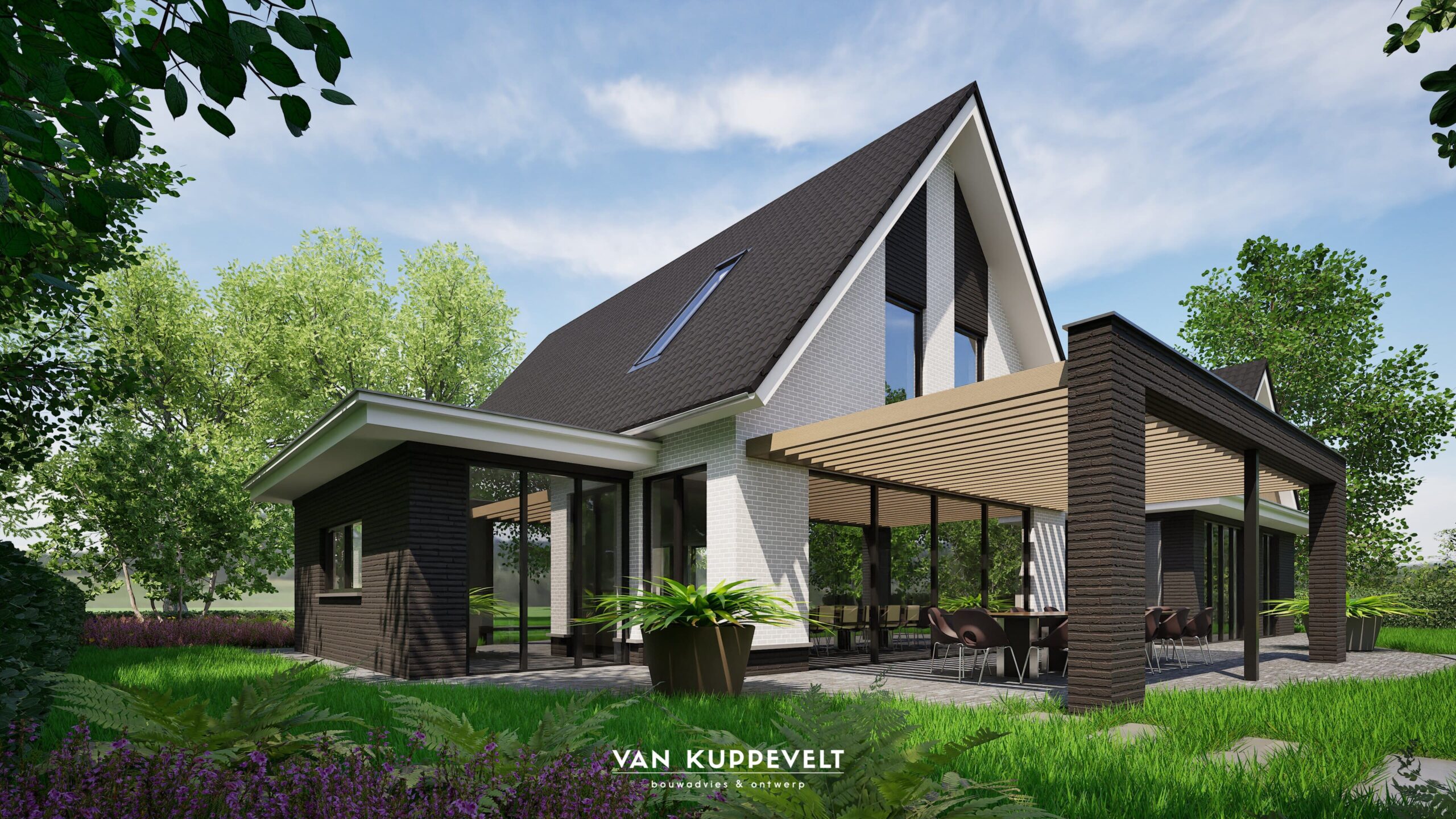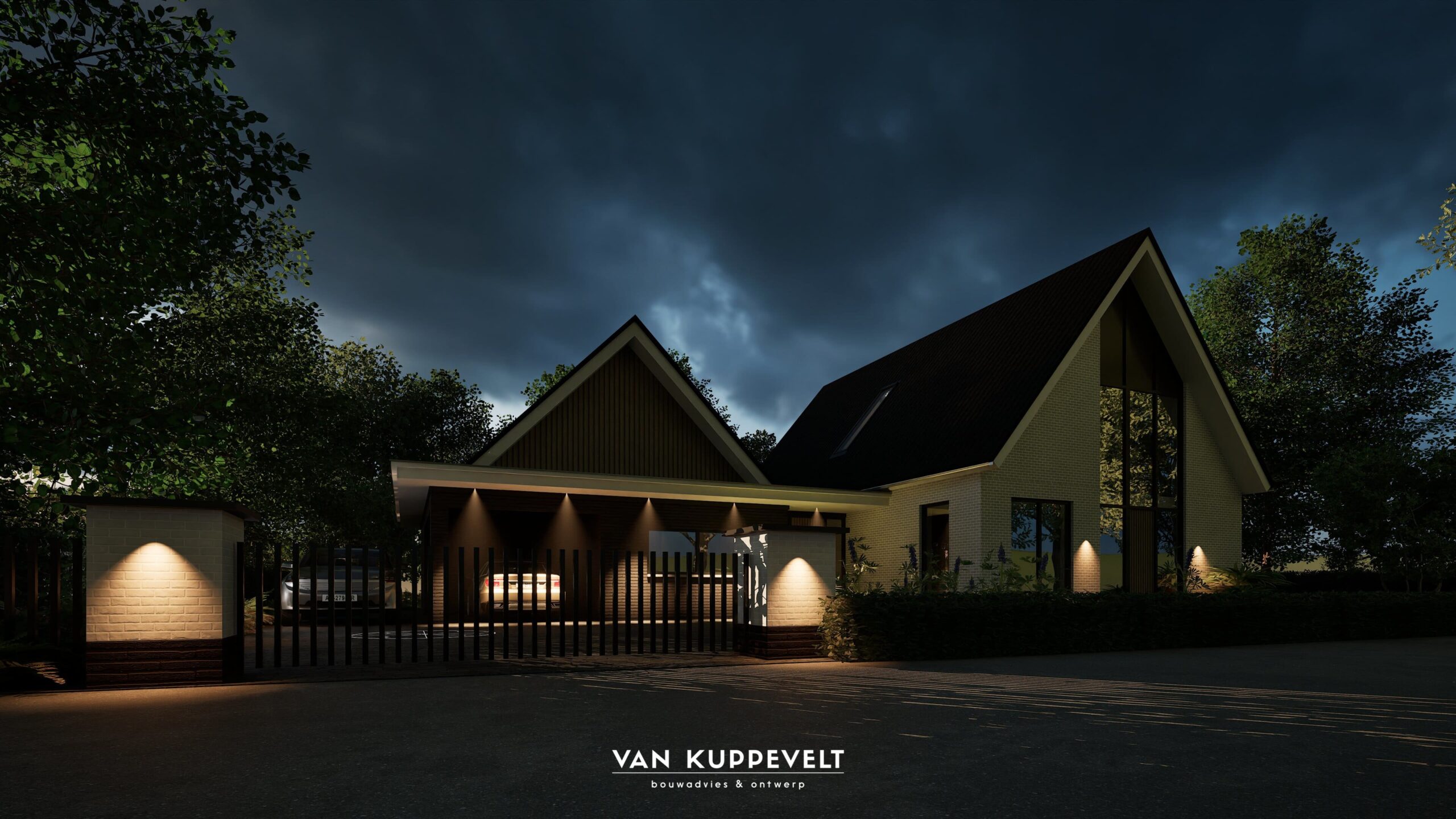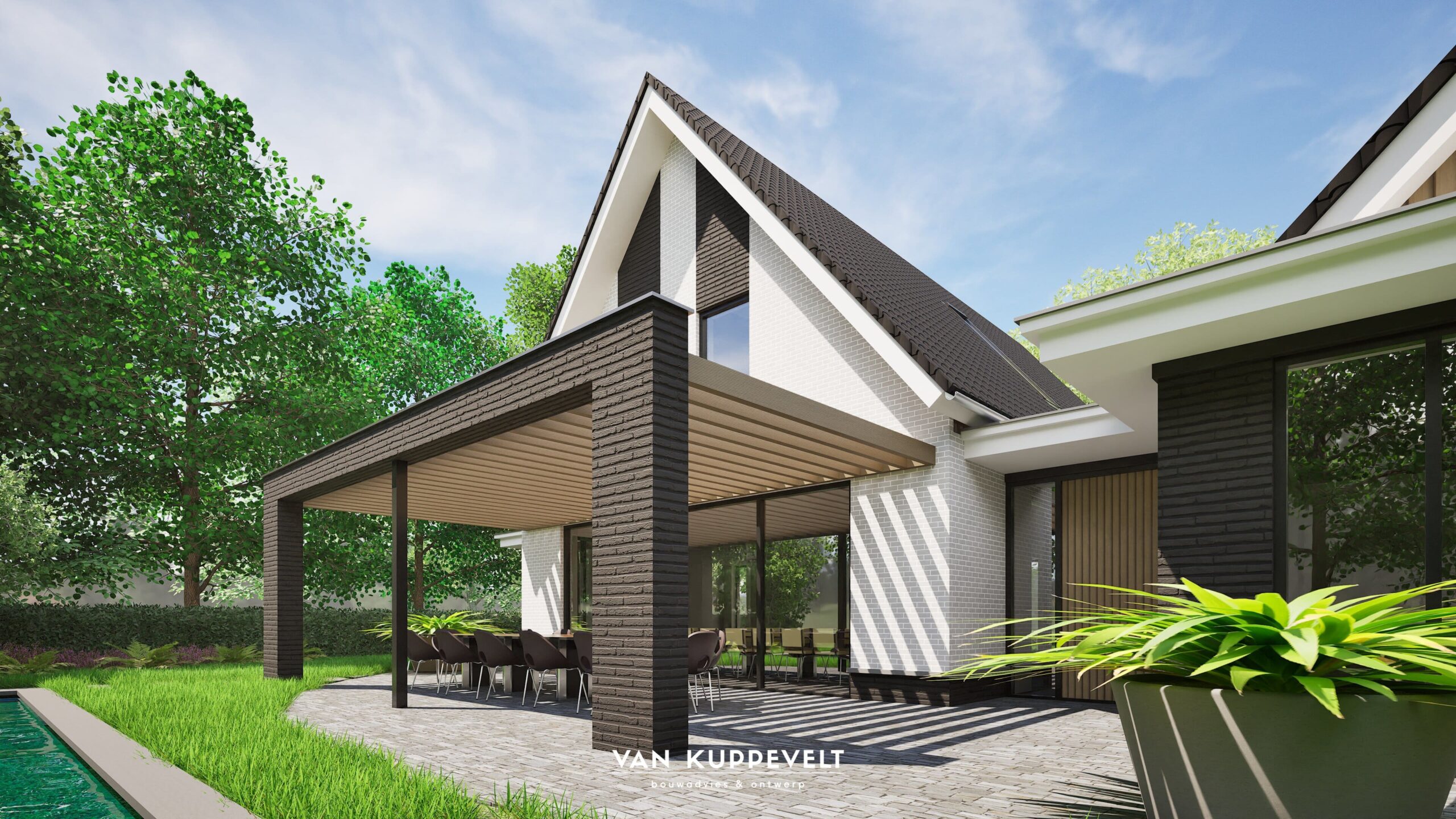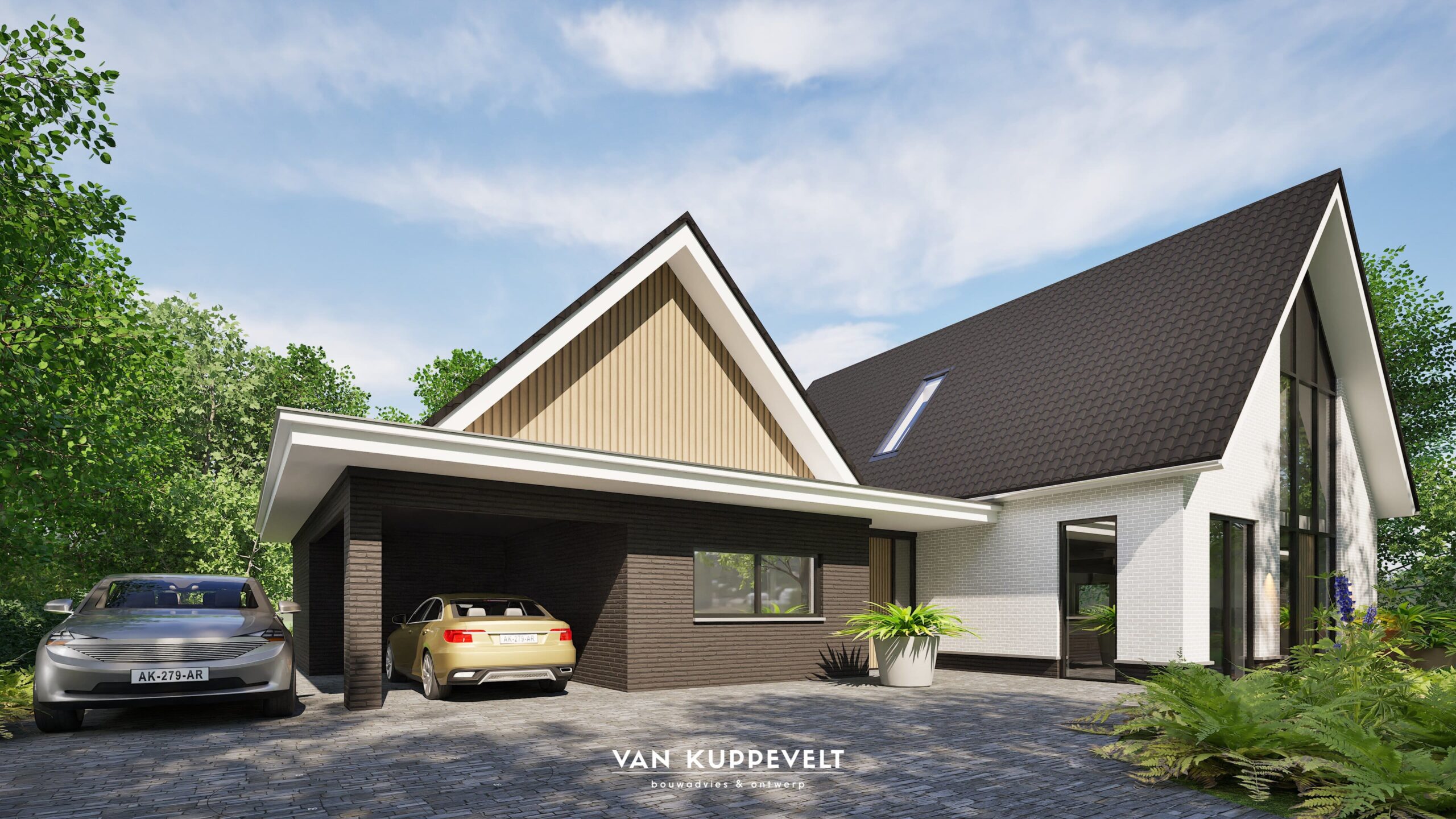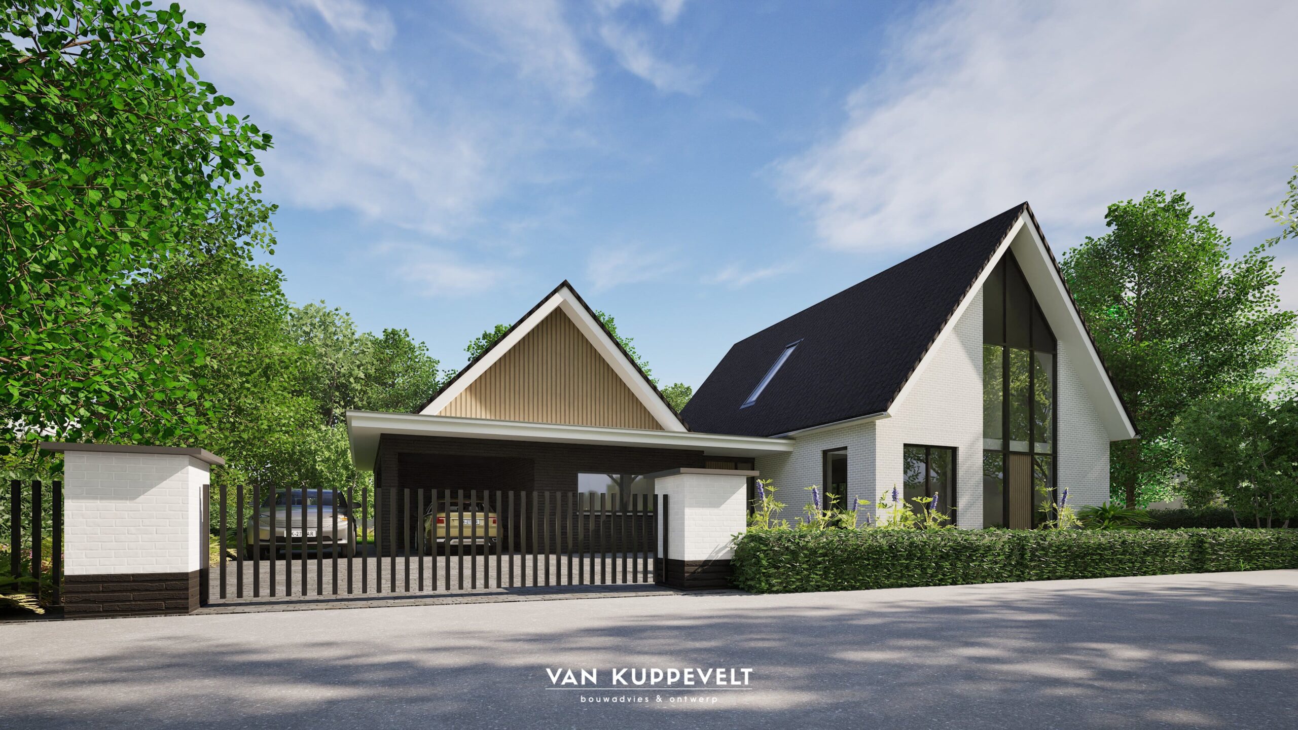Deze moderne villa wordt gerealiseerd in het buitengebied van Groesbeek. De woning heeft een strakke belijning met een speelse vormgeving. Het bijgebouw met een kap is ingekapseld in het platte dak van het tussenlid en carport. De achterzijde van de woning is voorzien van veel glas met uitzicht op de weilanden en het zwembad.