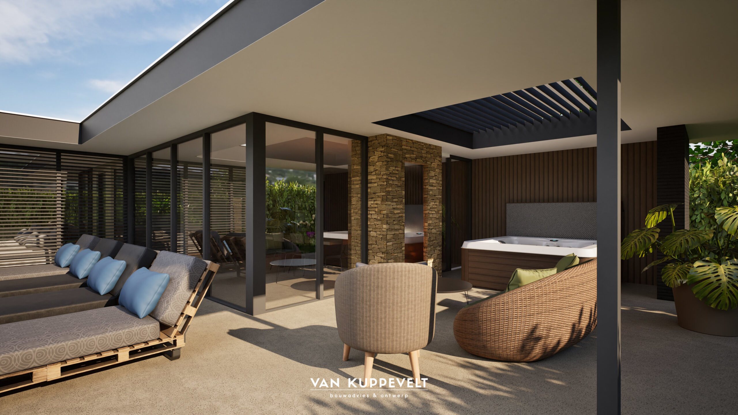 Dit luxe bijgebouw heeft een L-opstelling en is van alle gemakken voorzien. De ruime tuinkamer en achtergelegen berging met technische ruimte maken het tot een multifunctioneel bijgebouw. Vanuit de tuinkamer is de overkapping met jacuzzi bereikbaar. Het aangrenzende terras geeft mooi zicht op het zwembad en de woning aan de voorzijde.