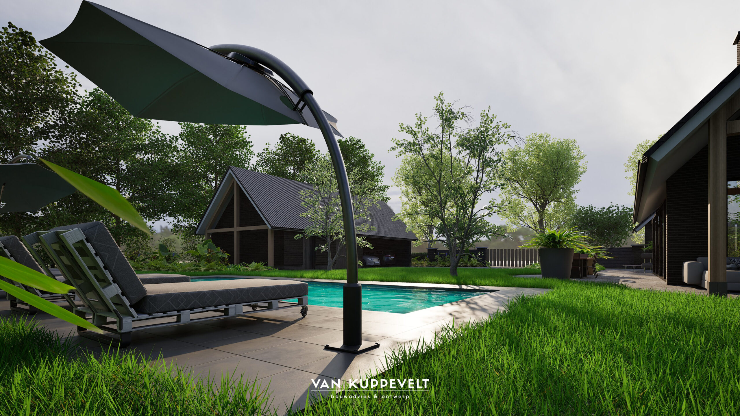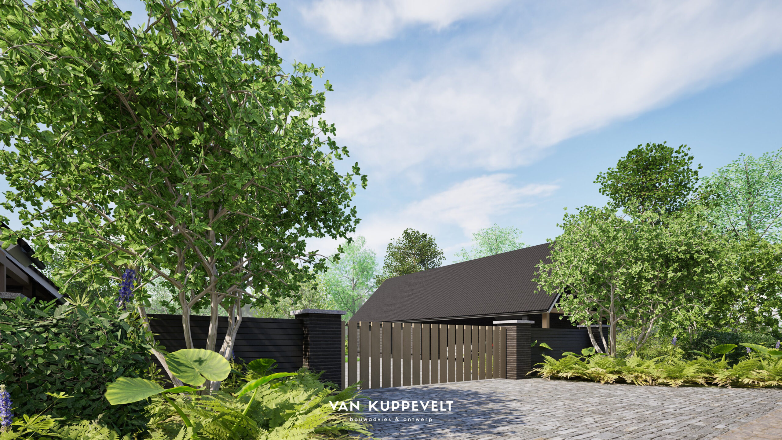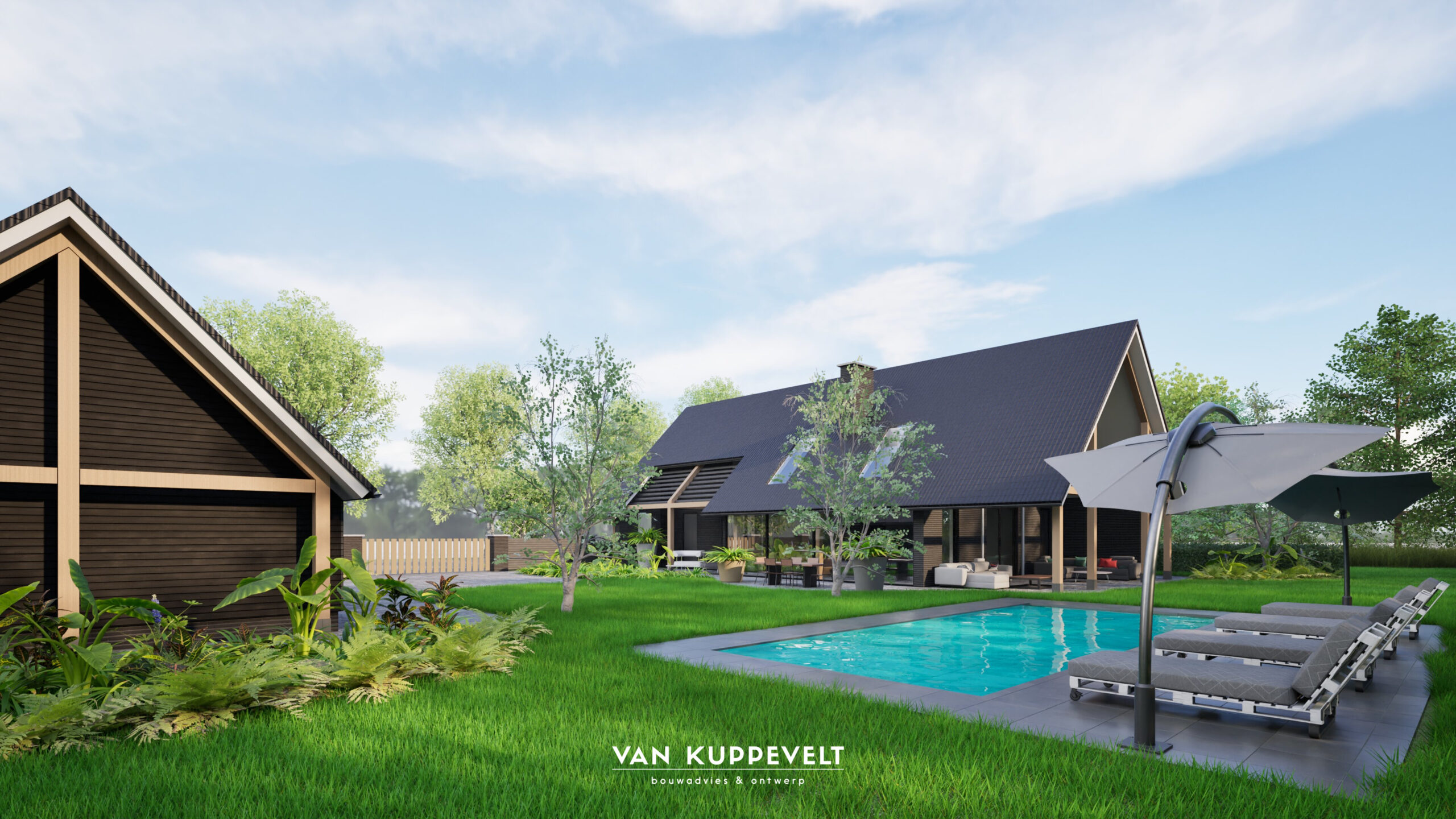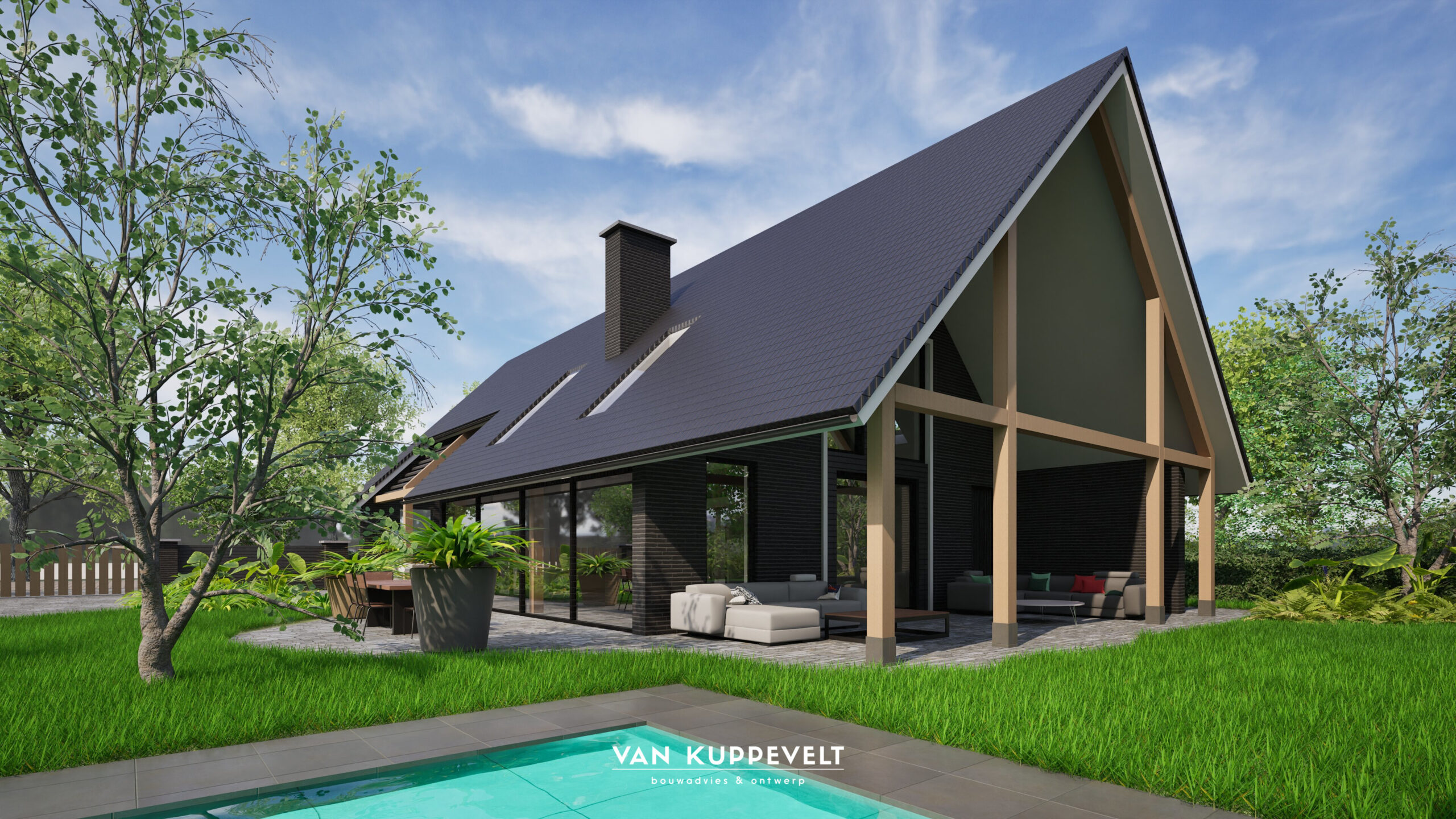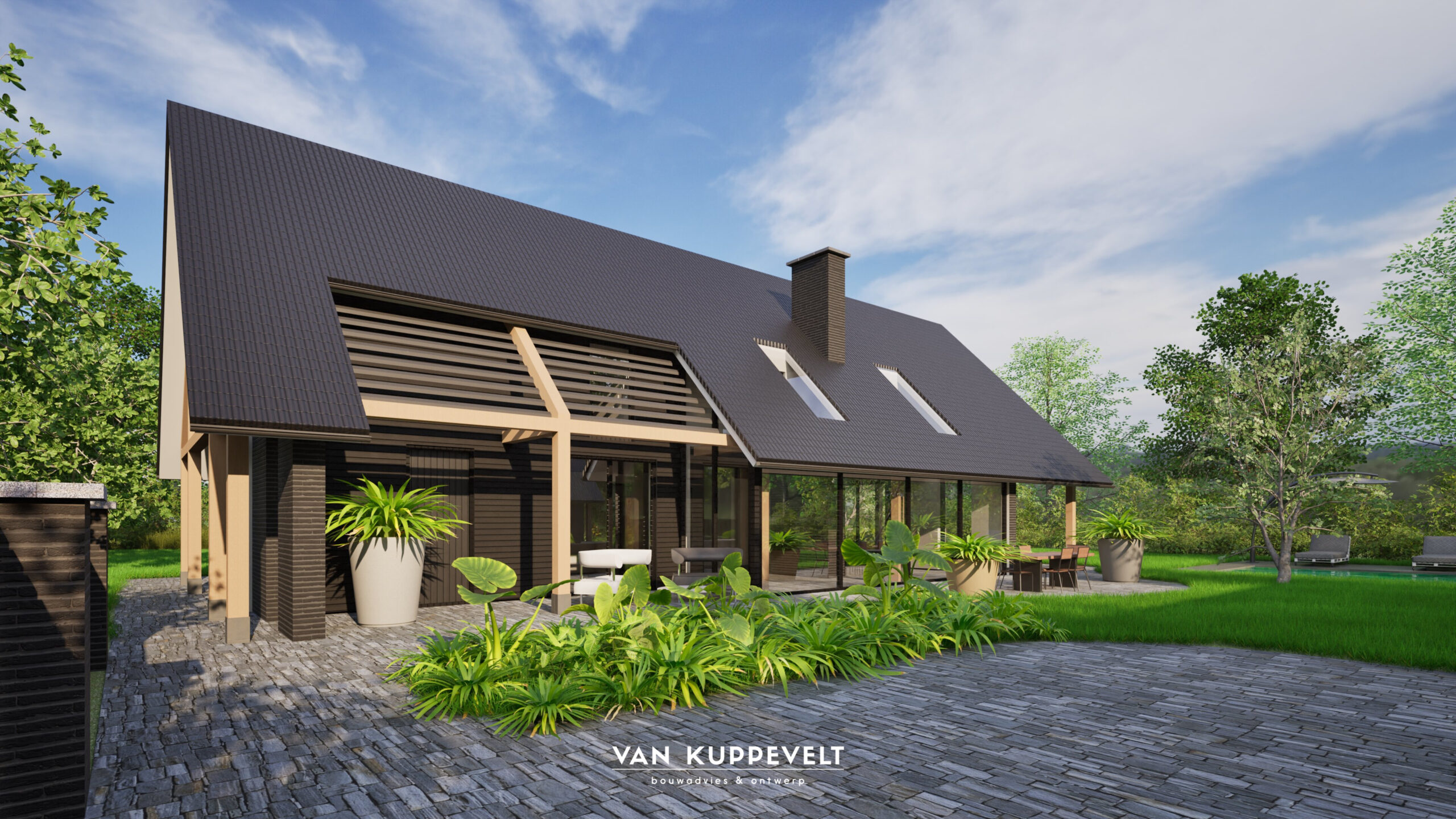 Een schuurwoning met een zichtbare doorlopende spantstructuur. De eikenhouten spanten zijn zichtbaar in de gehele woning en vormen ook de basis voor de hoofdconstructie. De kenmerkende stijl van een schuurwoning is hier van toepassing: langgerekt hoofdvolume met een lage goot en zadeldak. Aan de zijde van de hoofdentree is de kap deels opengewerkt en voorzien van eikenhouten lamellen. De glazen woonkamer is naar voren uitgebouwd en verspringt ten opzichte van de gevellijn bij de hoofdentree. Dit geeft een speels effect. Aan de achterzijde is een eiken houten spant gemaakt waar ook het overdekt terras is gesitueerd. Het grote bijgebouw is in een donkere kleurstelling met gemetselde plint en gepotdekselde delen uitgevoerd.