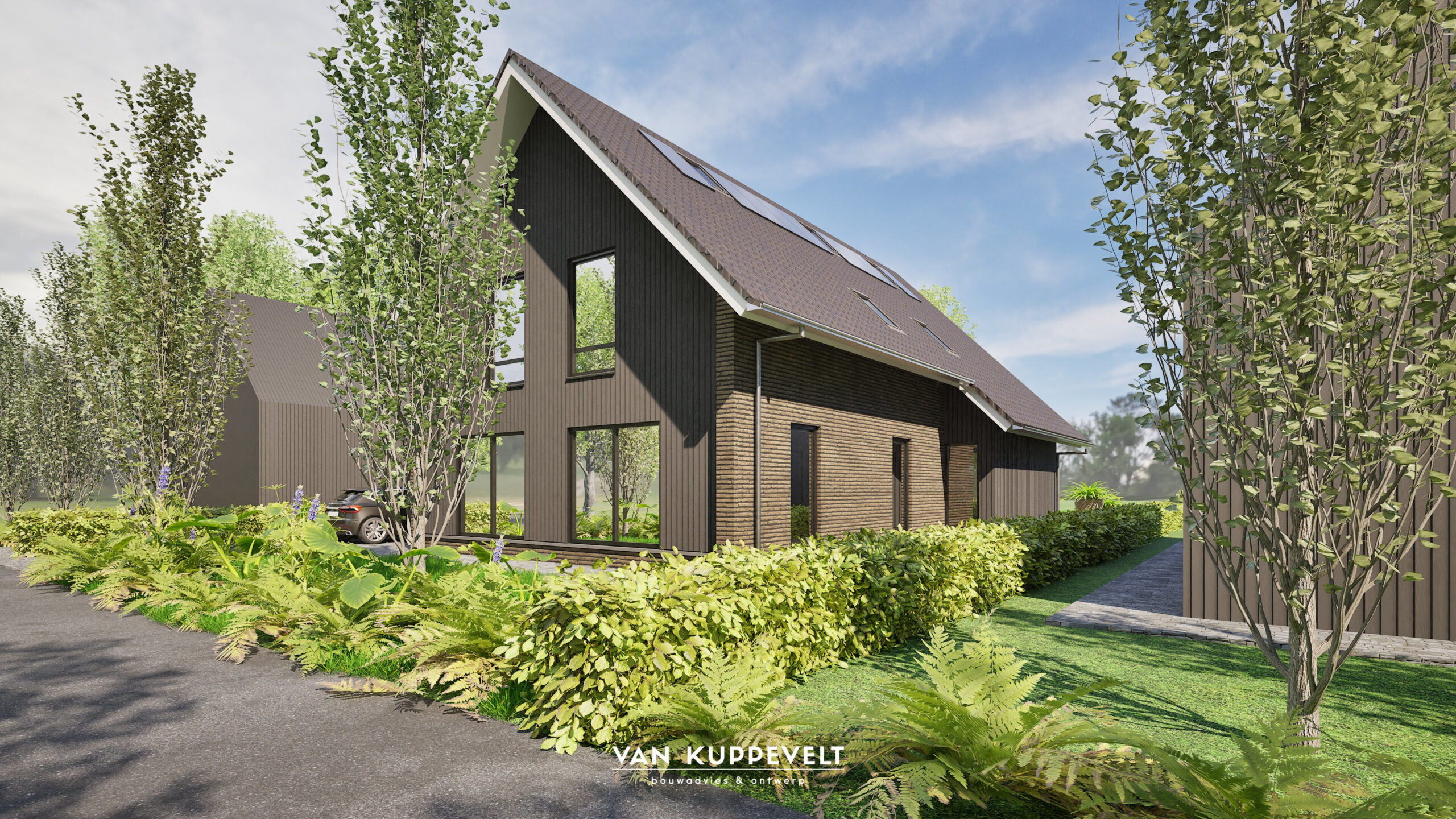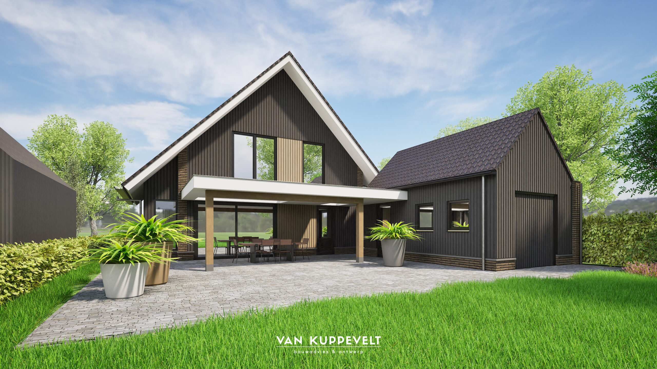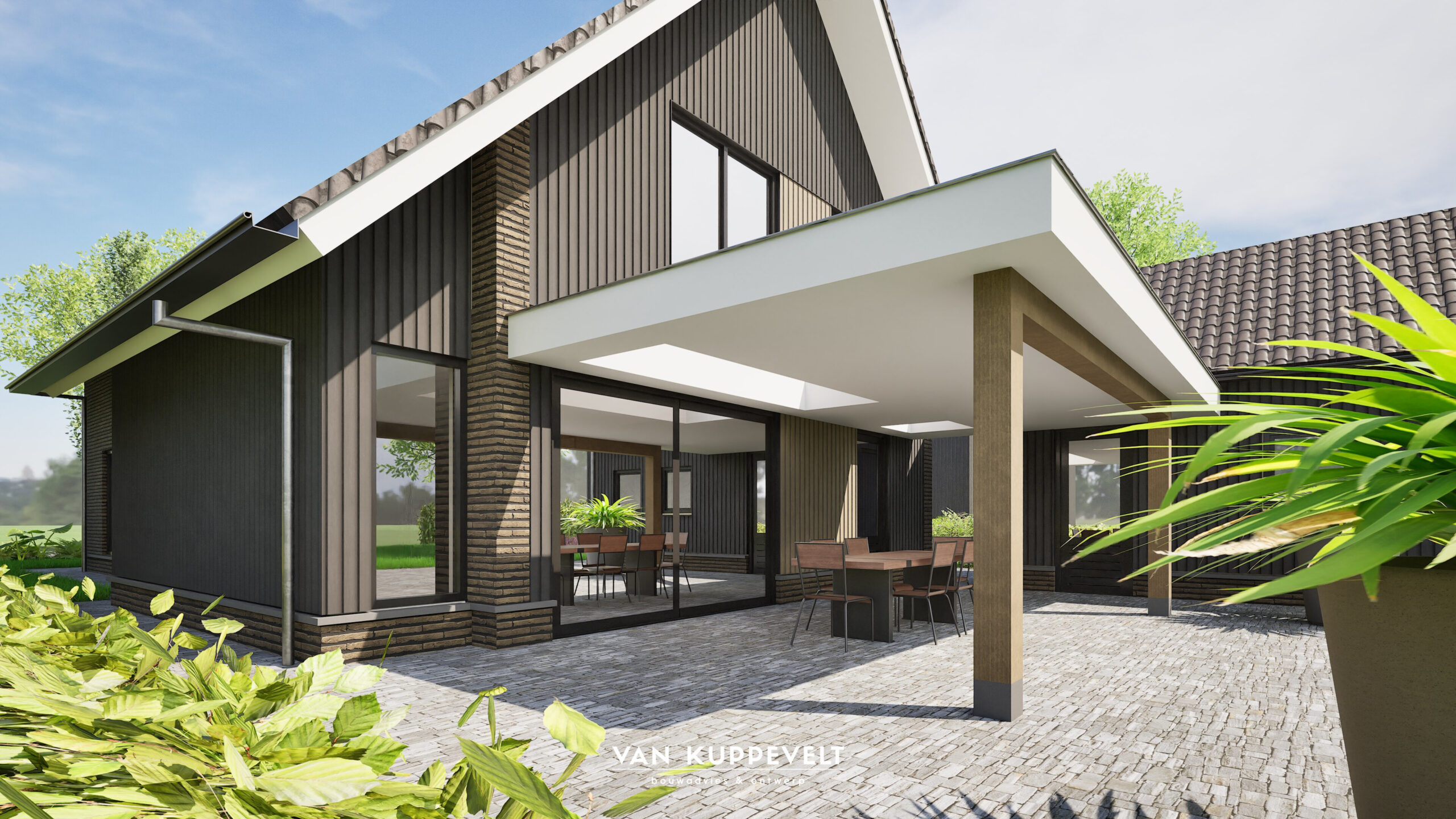 In het hart van Vianen (nb) wordt deze schuurwoning gerealiseerd. De opdrachtgevers wilden geen geheel donkerkleurige woning maar een mooie balans tussen aardetinten en donkere tinten. We hebben gekozen voor een heldere opzet. De langsgevels in metselwerk met een aardetint en beide kopgevels terug liggend met verticale houten geveldelen in de kleur zwart-grijs. Net boven het plintmetselwerk is gekozen voor een hardstenen spekband. Hierop zijn de gevelkozijnen van de begane grond uitgelijnd. De hoofdentree van de woning is uitgevoerd met een eiken spant waarop het schuine dak van de entree rust.