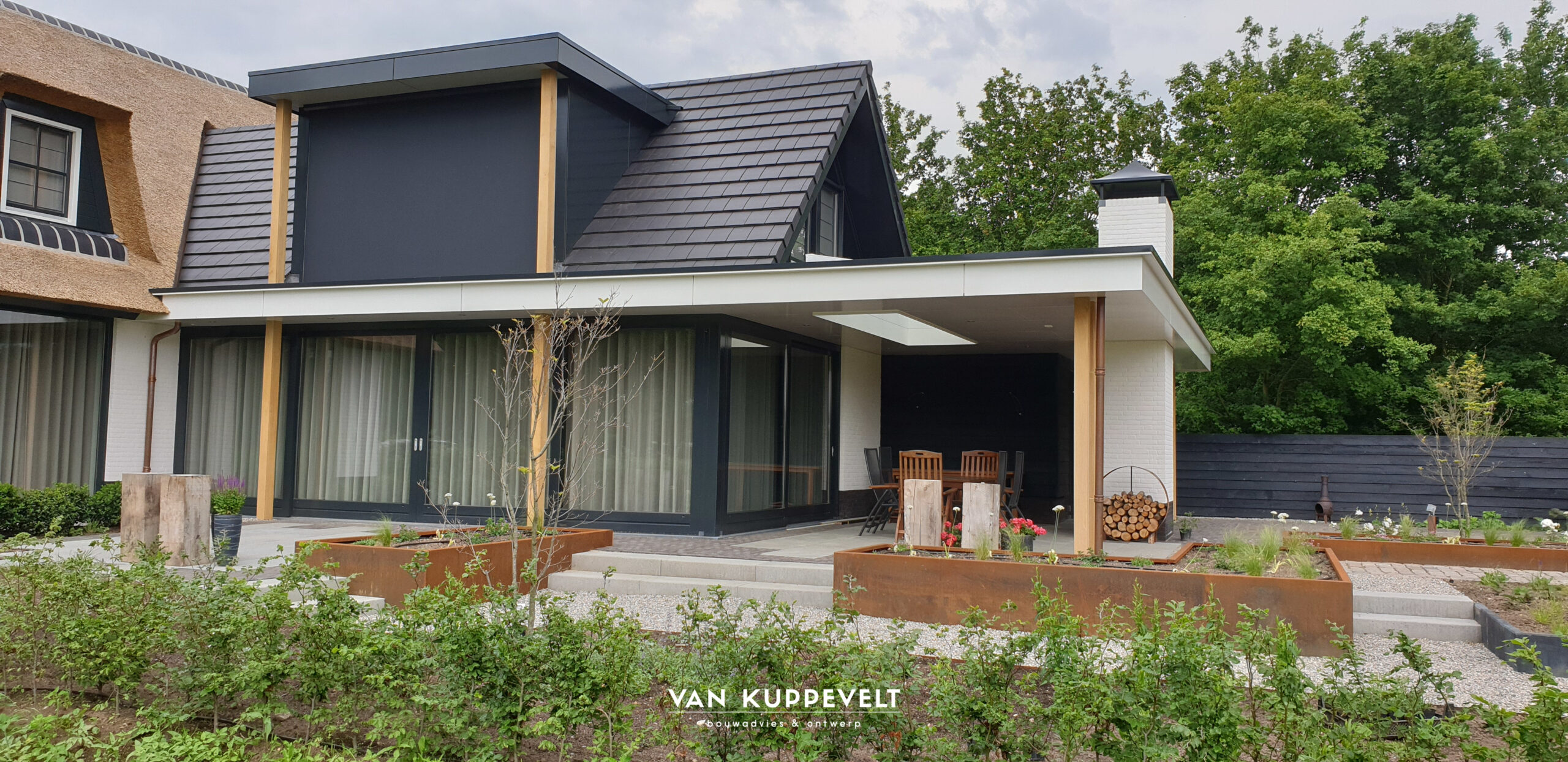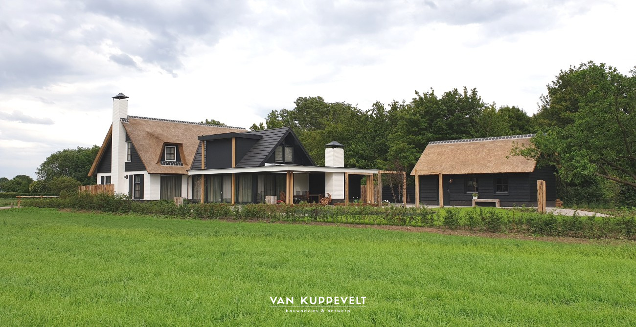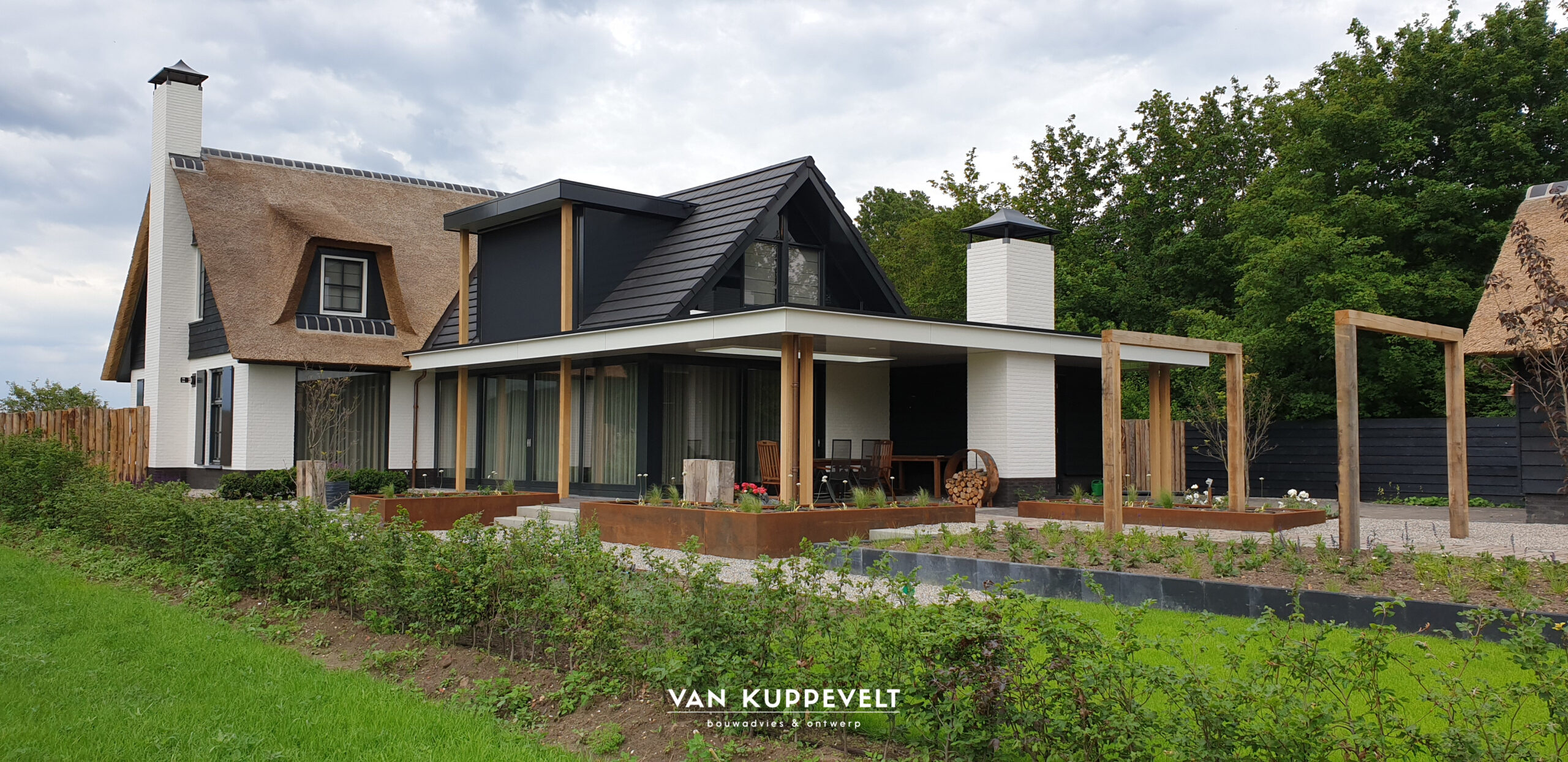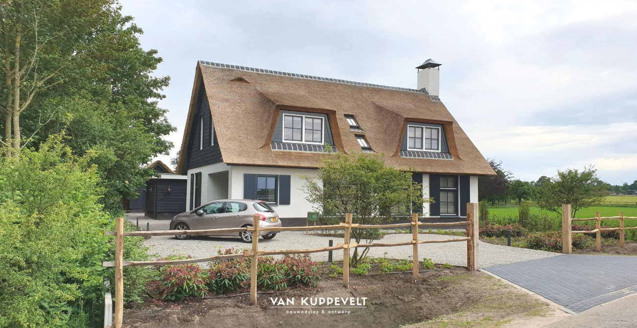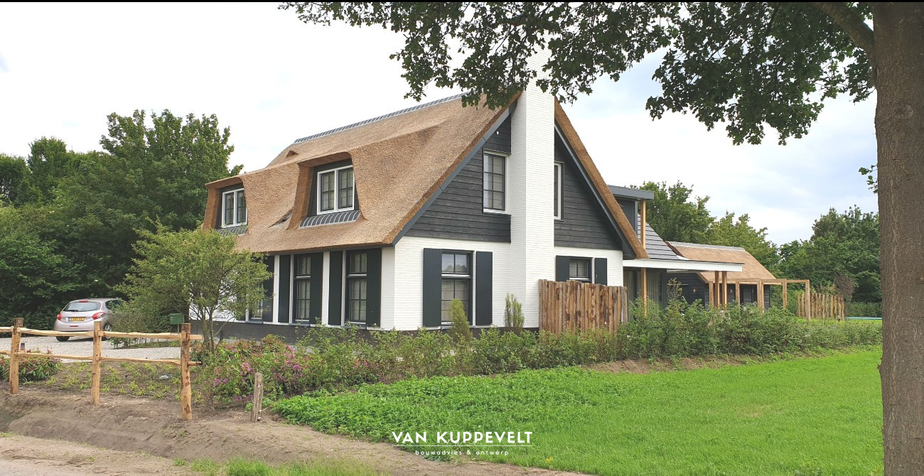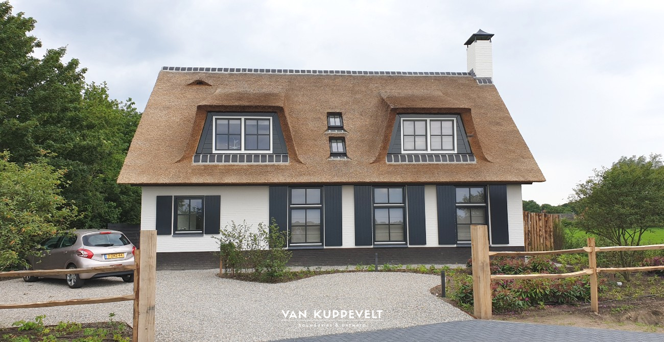 Een ruim landhuis met twee gezichten. De straatgevel is vormgegeven in boerderij-stijl met een rieten kap. De uitbouw aan de achterzijde is geheel eigentijds en modern opgezet. Veel glas in de ruime woonkeuken en een dakafwerking van leipannen. De grote overkapping in combinatie met de markante dakkapel geven het geheel een frisse moderne uitstraling.
