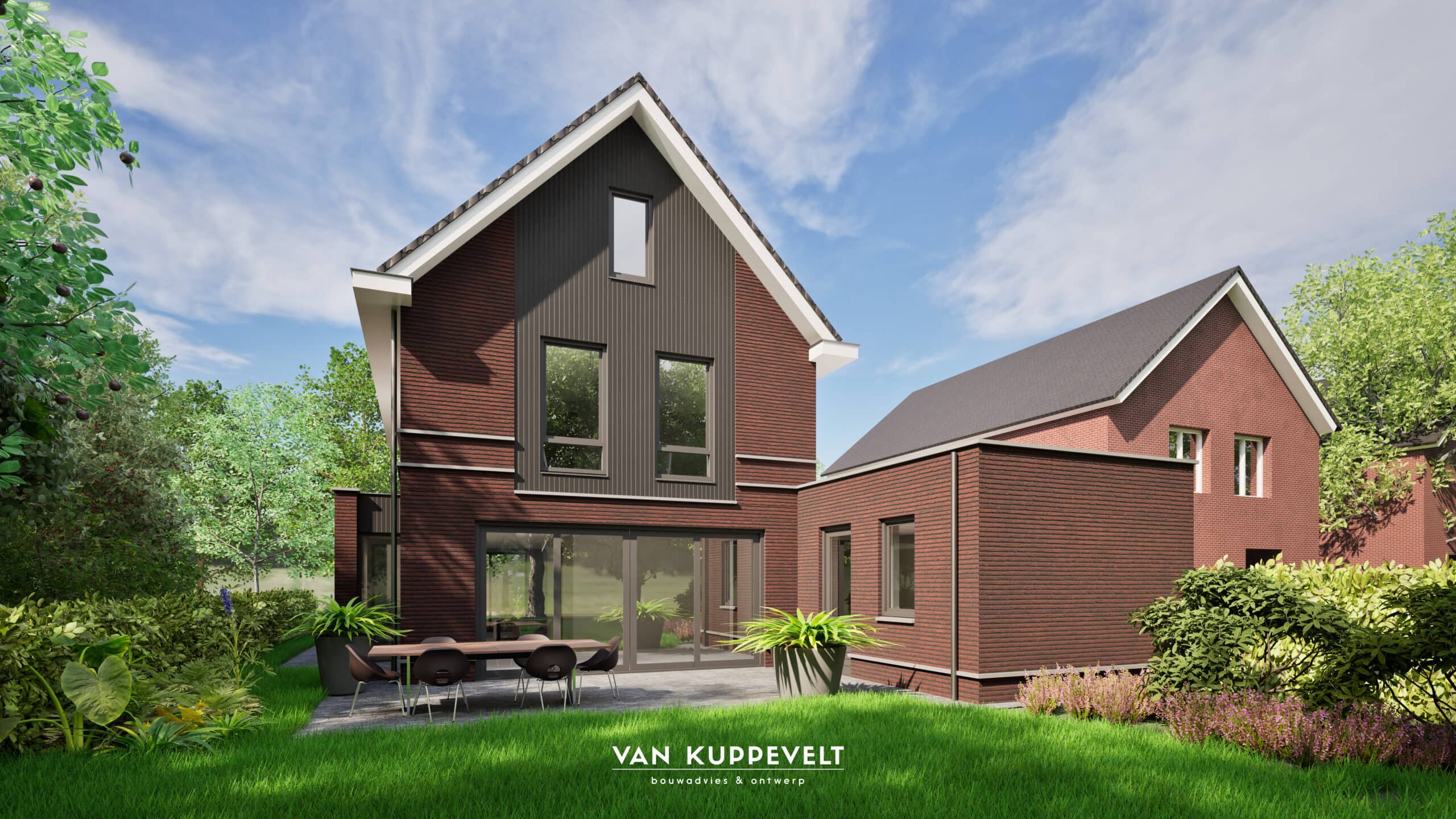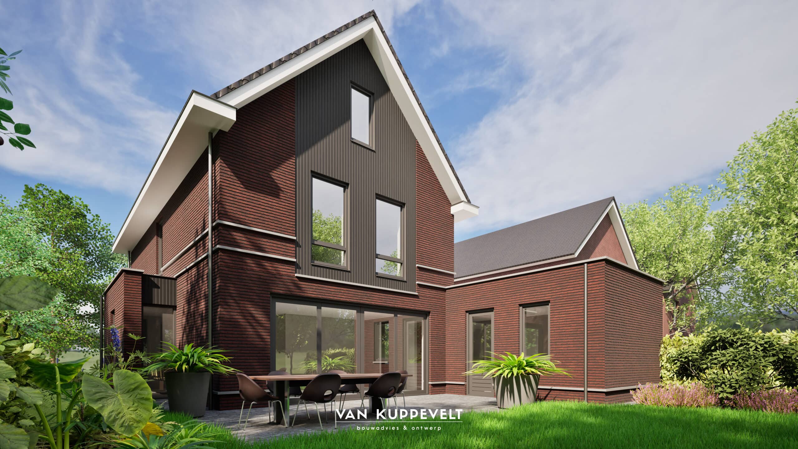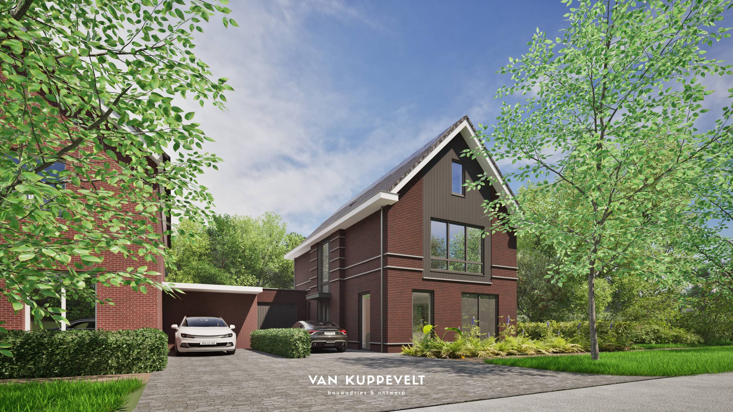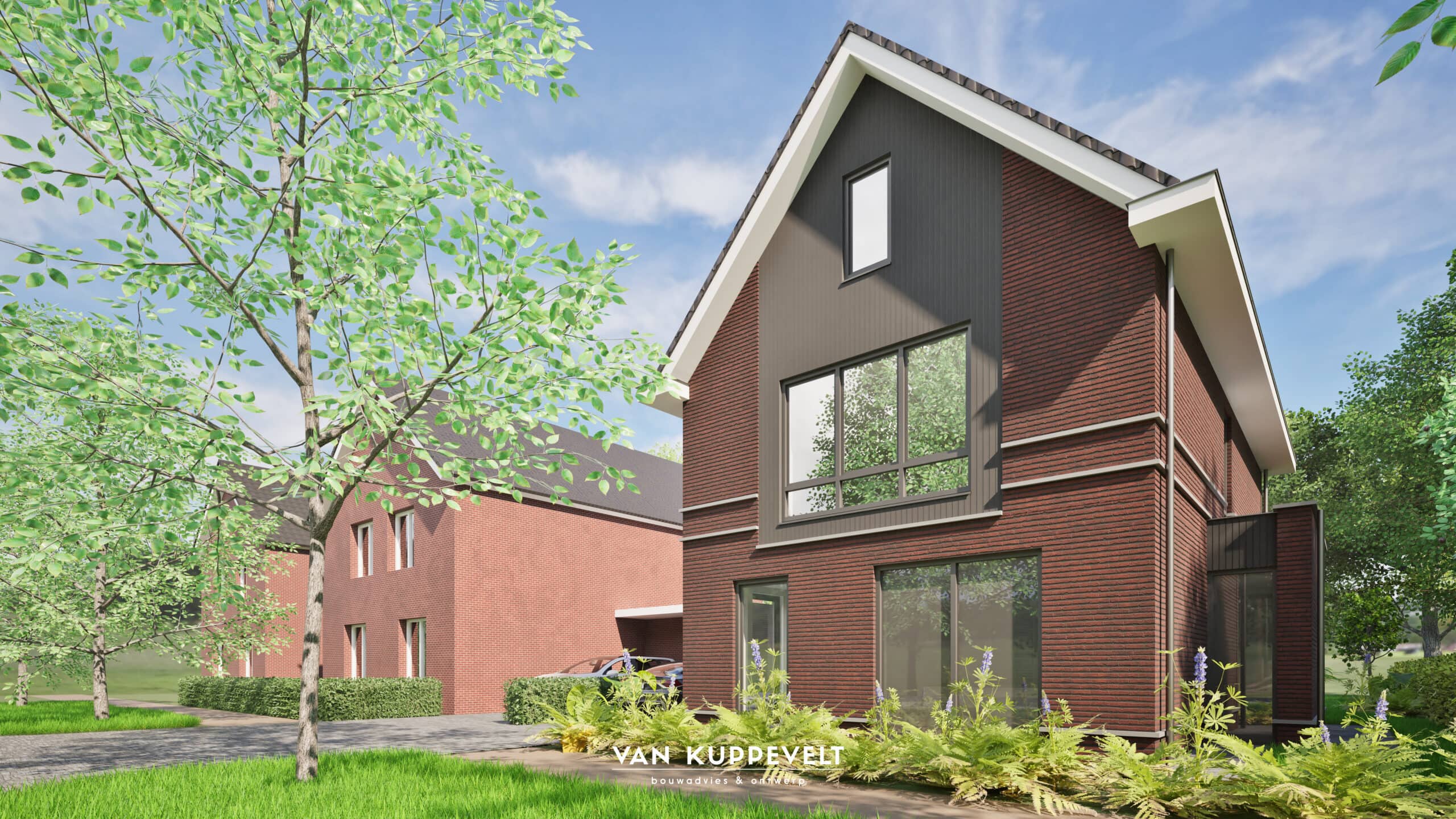 Deze riante woning staat aan de rand van Groesbeek in een lint van woningen met rode bakstenen. Dit was ook een vereiste vanuit het beeldkwaliteitsplan. We hebben gekozen voor een rood-paarse variant in de gevelstenen in plaats van de standaard rode baksteen. De opdrachtgever wilde een woning met een sterke en overtuigende identiteit. Door beide kopgevels deels met hout uit te voeren en doorlopende speklagen toe te passen hebben we een eigen identiteit gecreëerd. Bij de hoofdentree is een duidelijk blok gemaakt dat de entree accentueert. Het entree-element bestaat uit een aantal horizontale belijningen met spekbanden en een verticaal georiënteerd kozijn. Naast dit kozijn komt een strook met geveldelen, net als in de voorgevel. De donkere luifel net boven de voordeur gaat op in het verticale element.