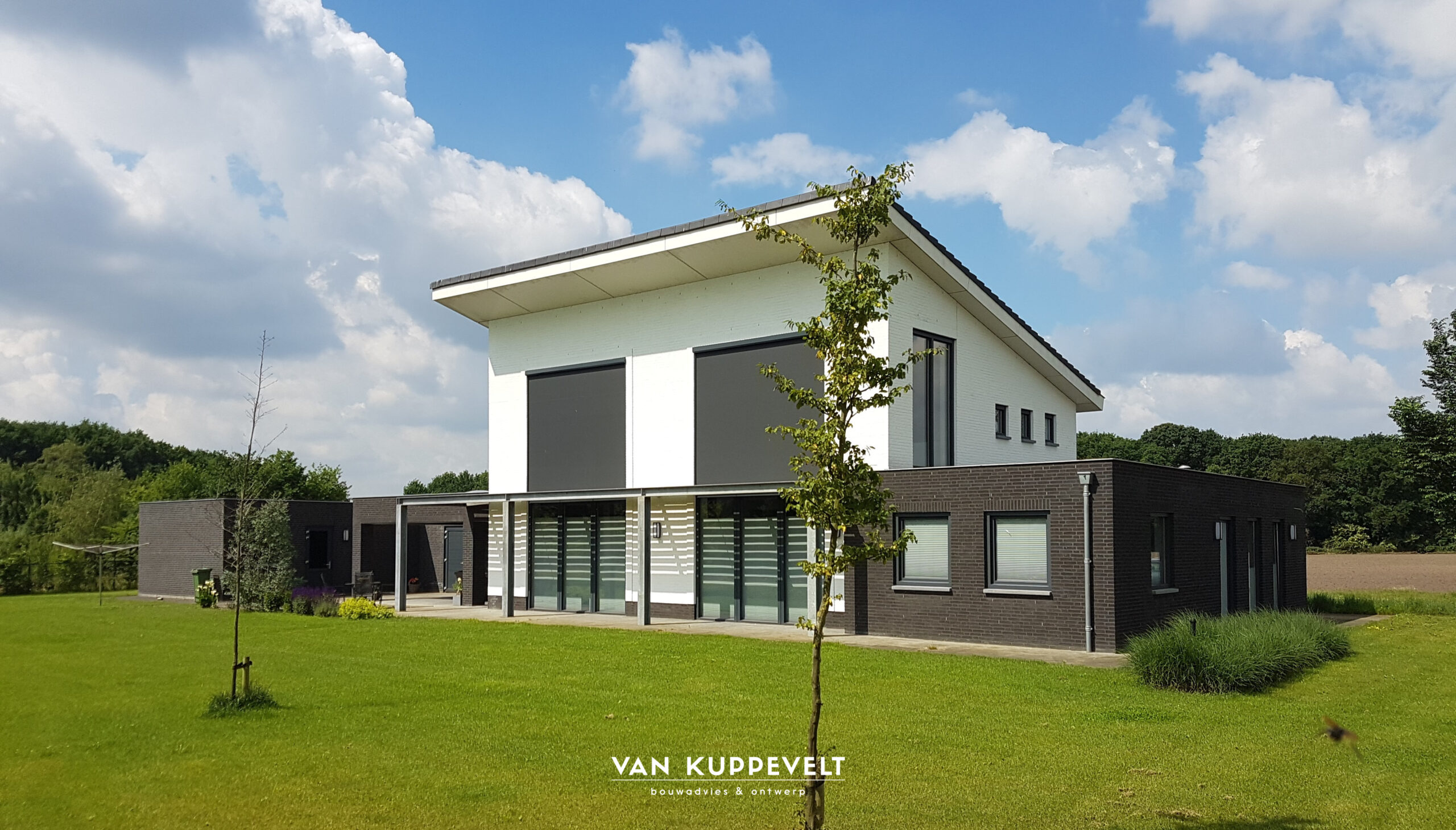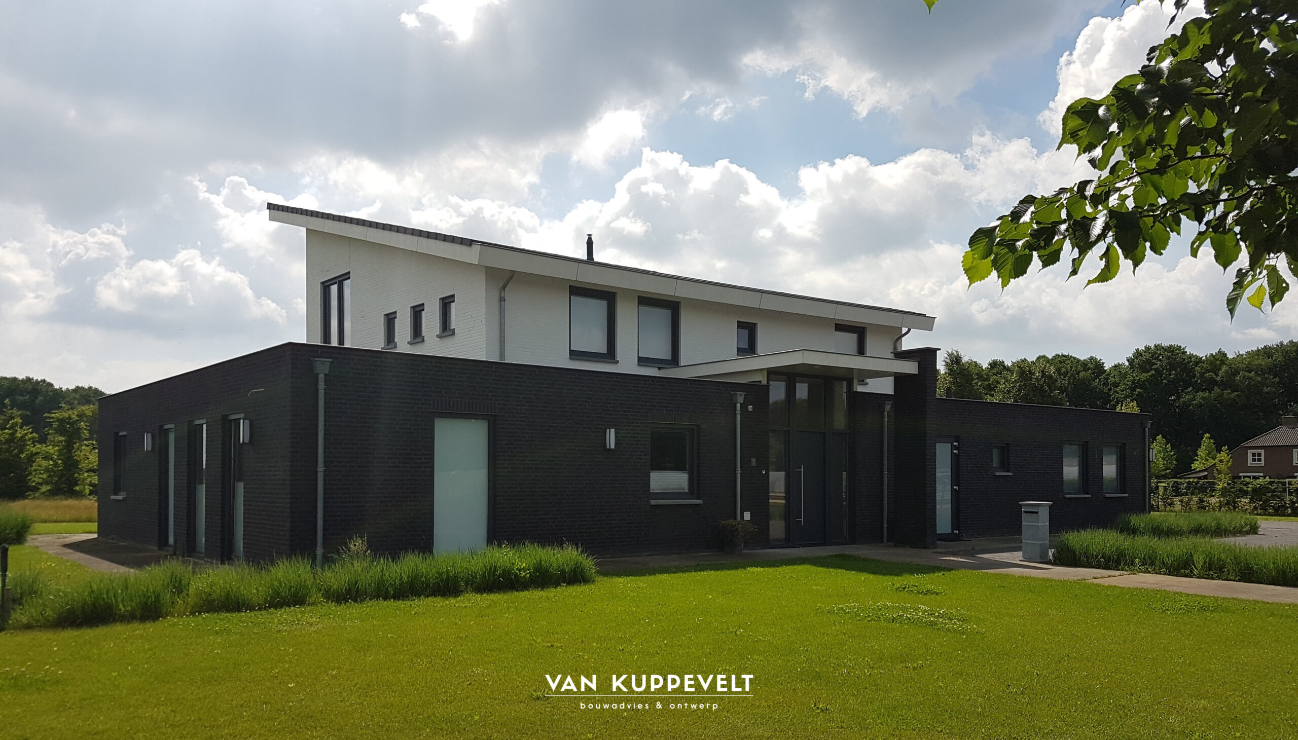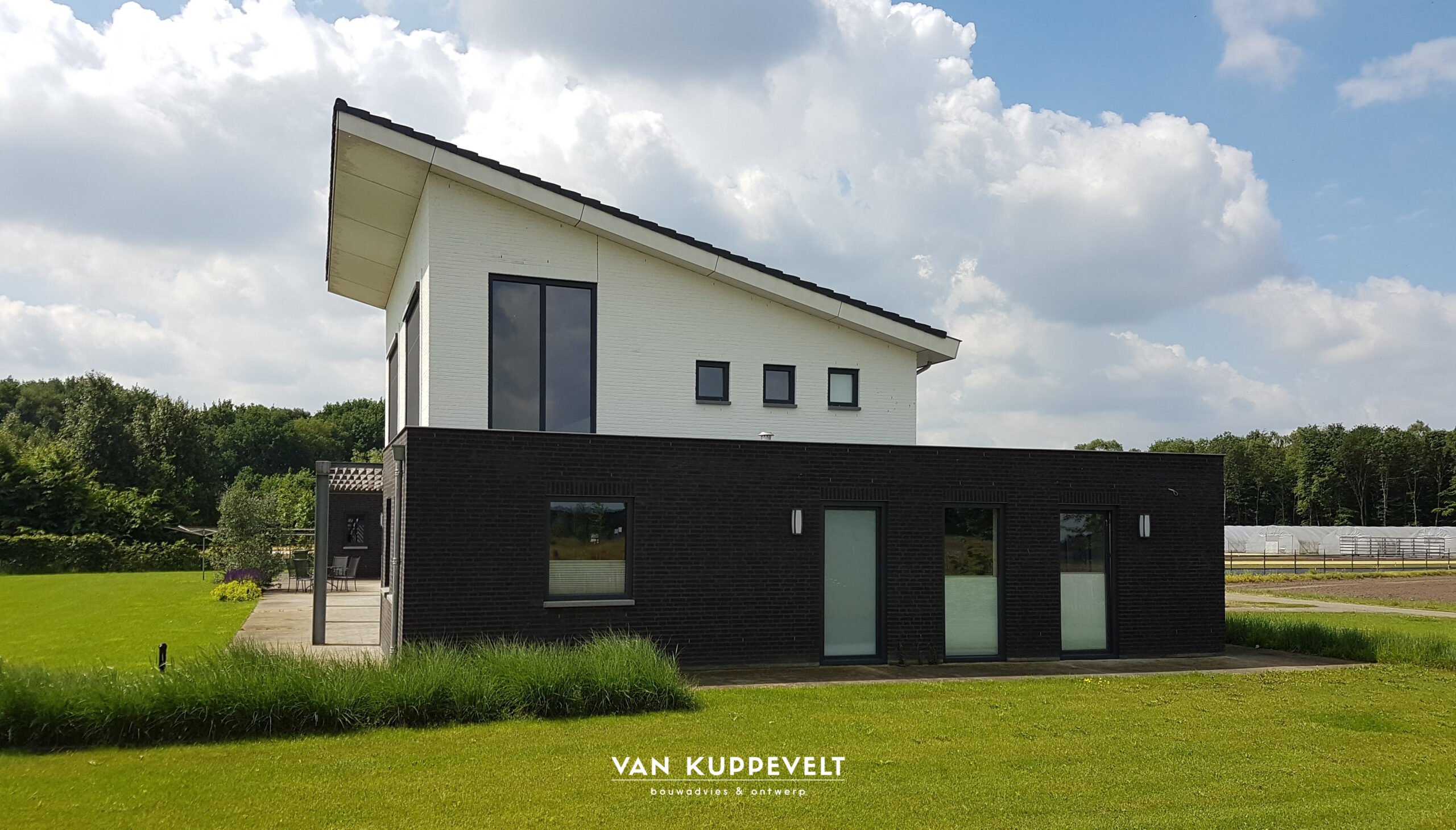 Moderne ruime woning aan de rand van een bijbehorend golfterrein. Deze beheerderswoning is ruim opgezet met veel glas aan de golfbaan-zijde. Het wit-grijze hoofdgebouw is “omkaderd” met een lage bebouwing van zwart metselwerk. De grote gevelpuien zorgen voor veel lichtinval in het leefgebied. De grote vide met balustrade op de 1e verdieping bevindt zich in de woonkamer en woonkeuken. Dit zorgt voor een open woonbeleving aan de achterzijde van de woning.