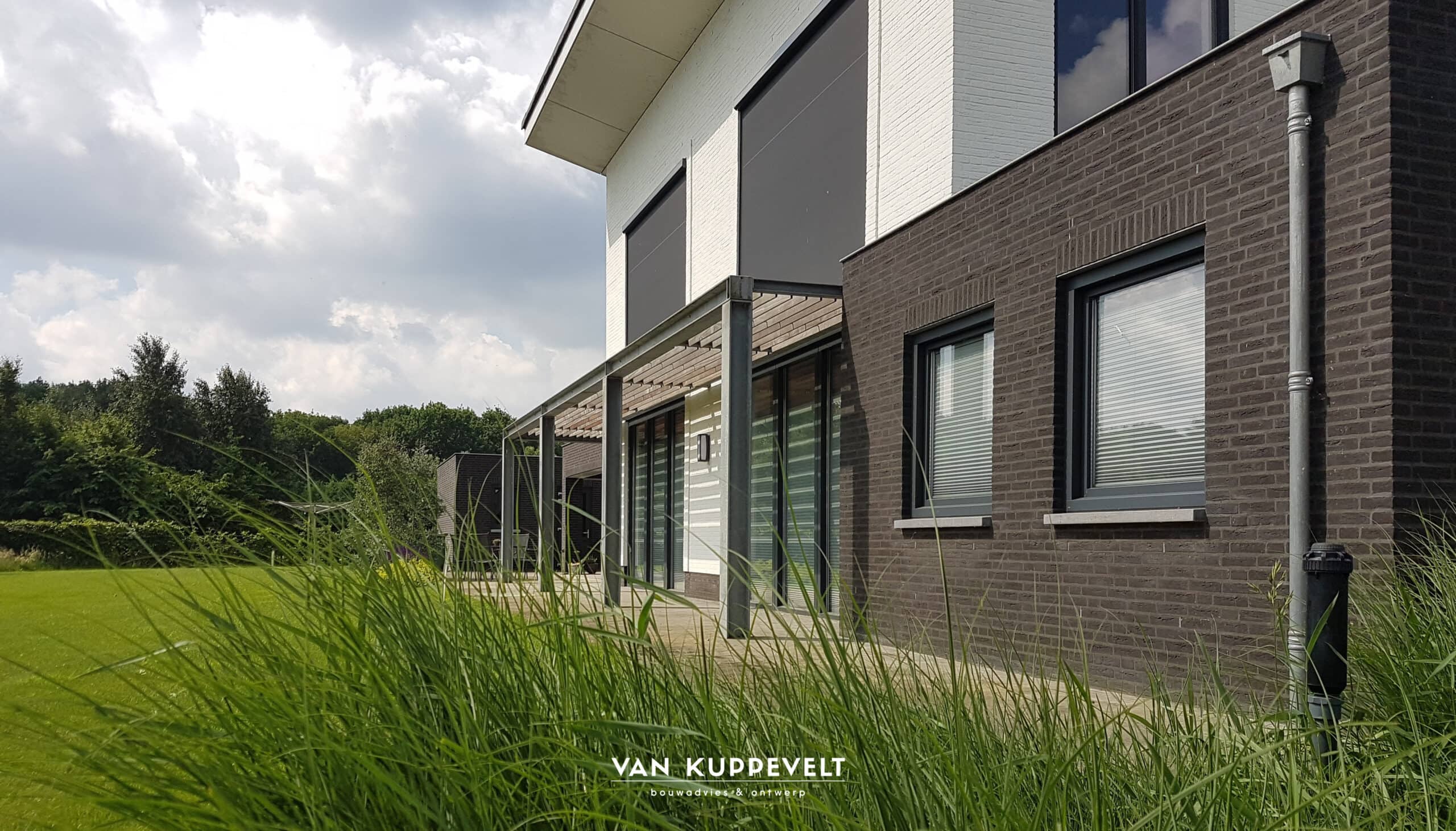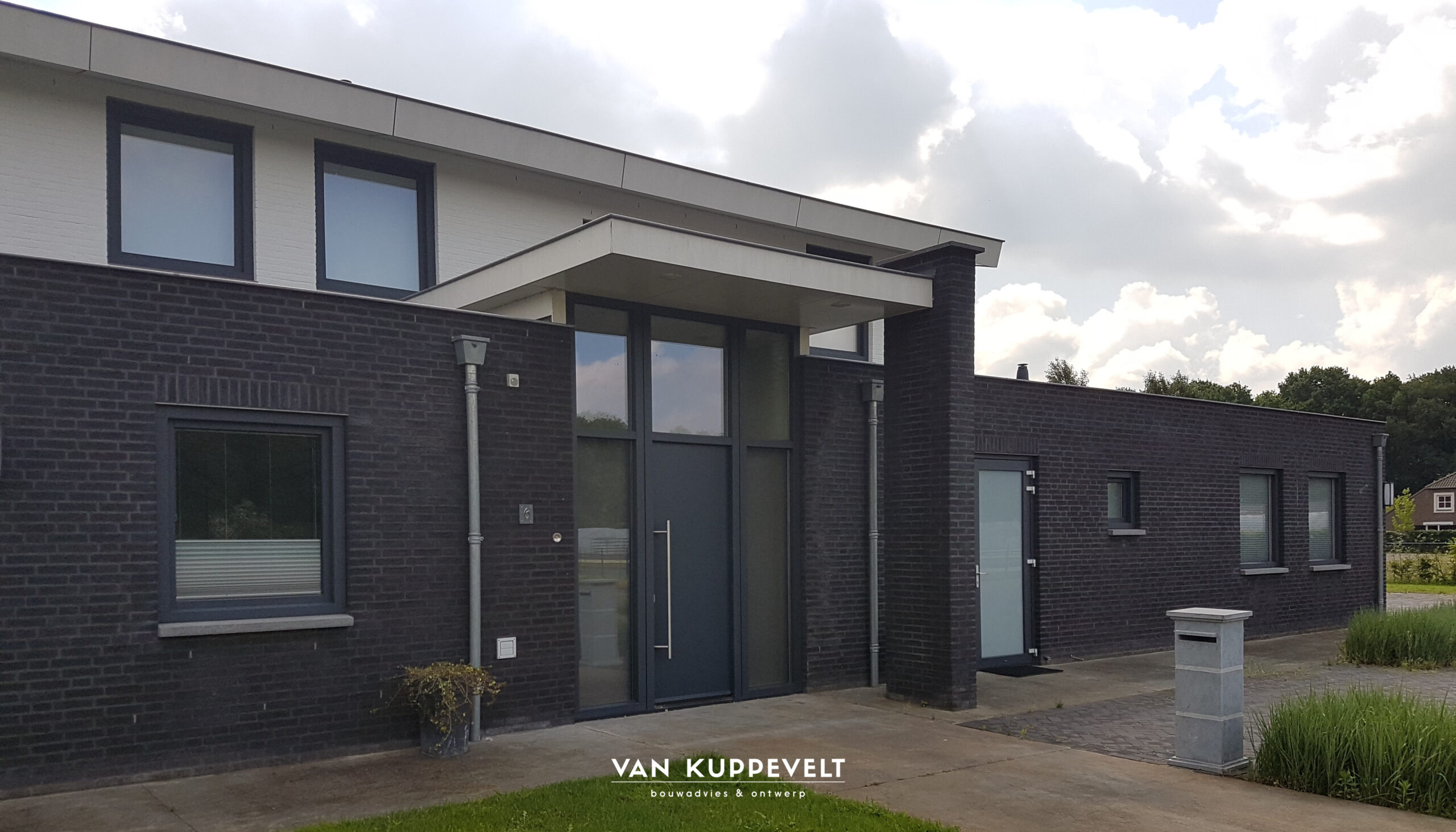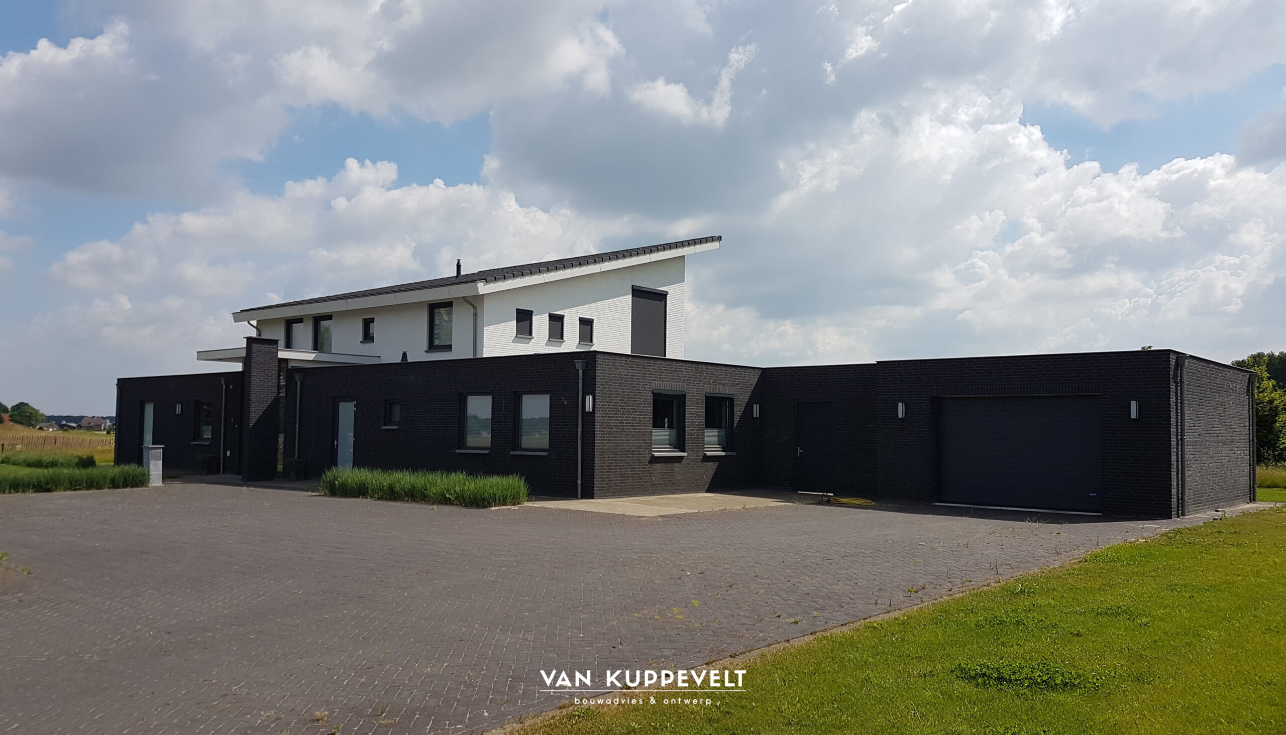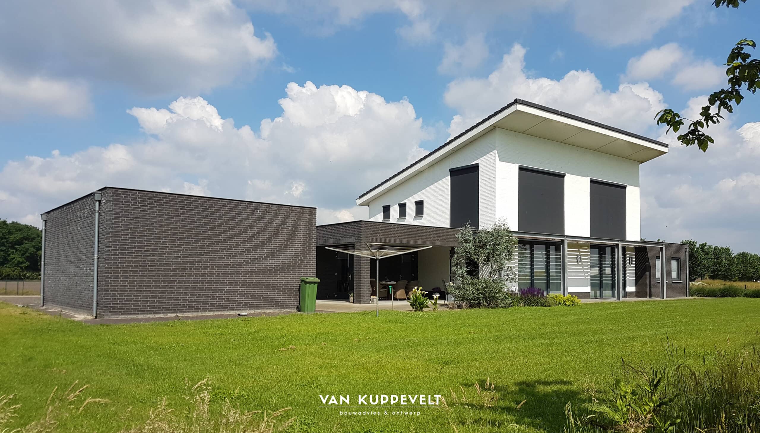 Moderne ruime woning aan de rand van een bijbehorend golfterrein. Deze beheerderswoning is ruim opgezet met veel glas aan de golfbaan-zijde. Het wit-grijze hoofdgebouw is “omkaderd” met een lage bebouwing van zwart metselwerk. De grote gevelpuien zorgen voor veel lichtinval in het leefgebied. De grote vide met balustrade op de 1e verdieping bevindt zich in de woonkamer en woonkeuken. Dit zorgt voor een open woonbeleving aan de achterzijde van de woning.