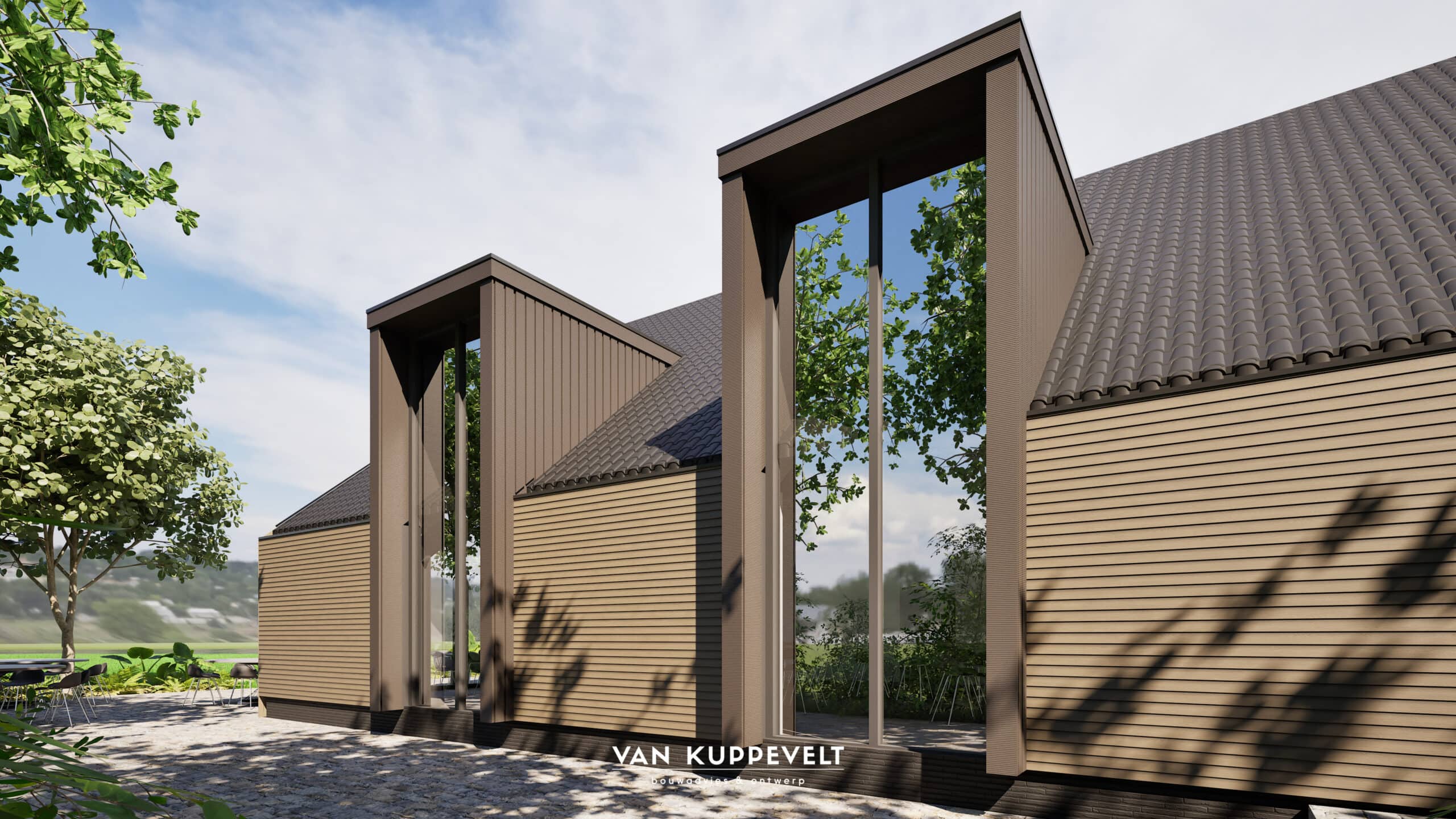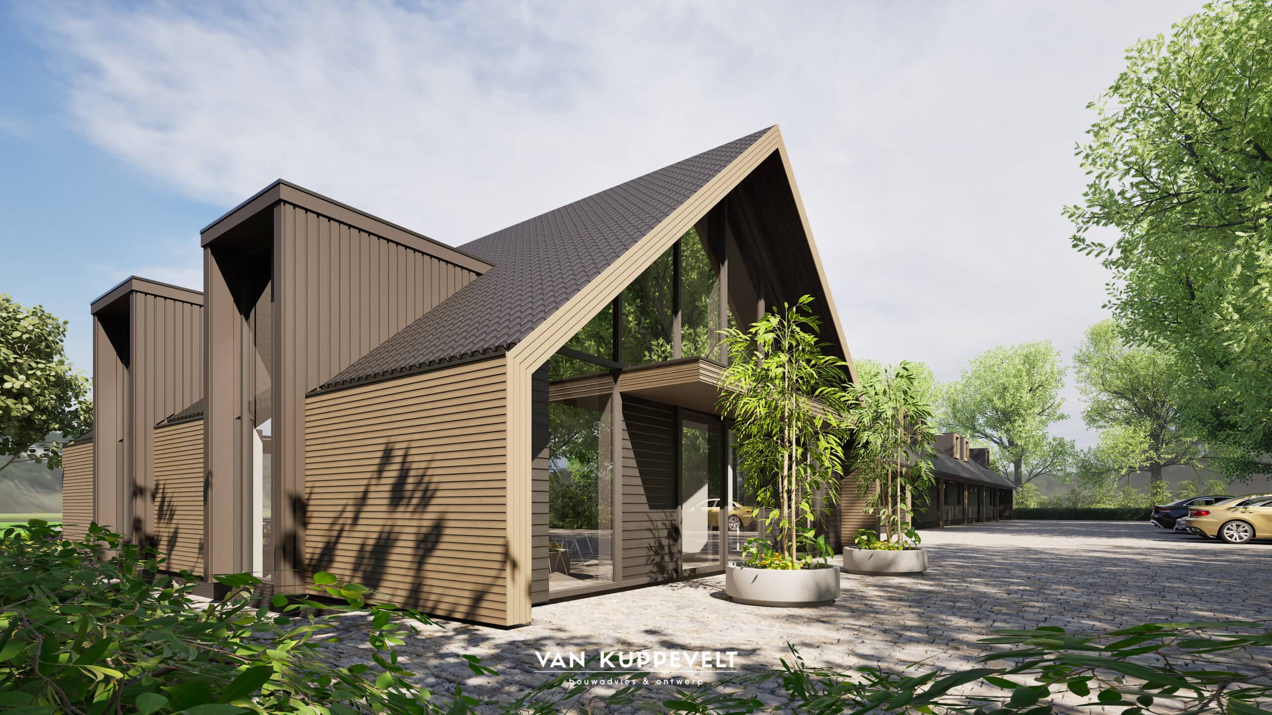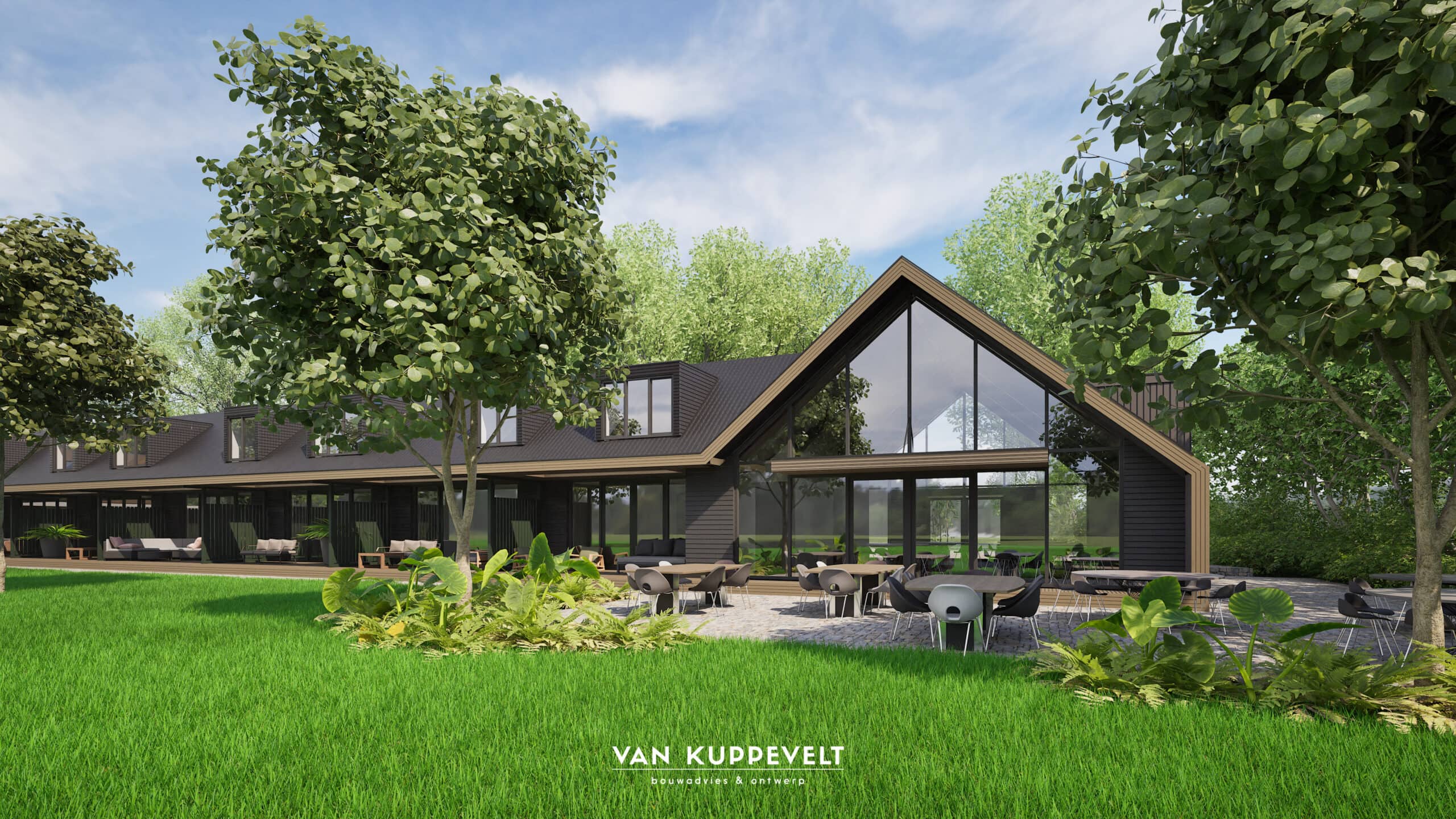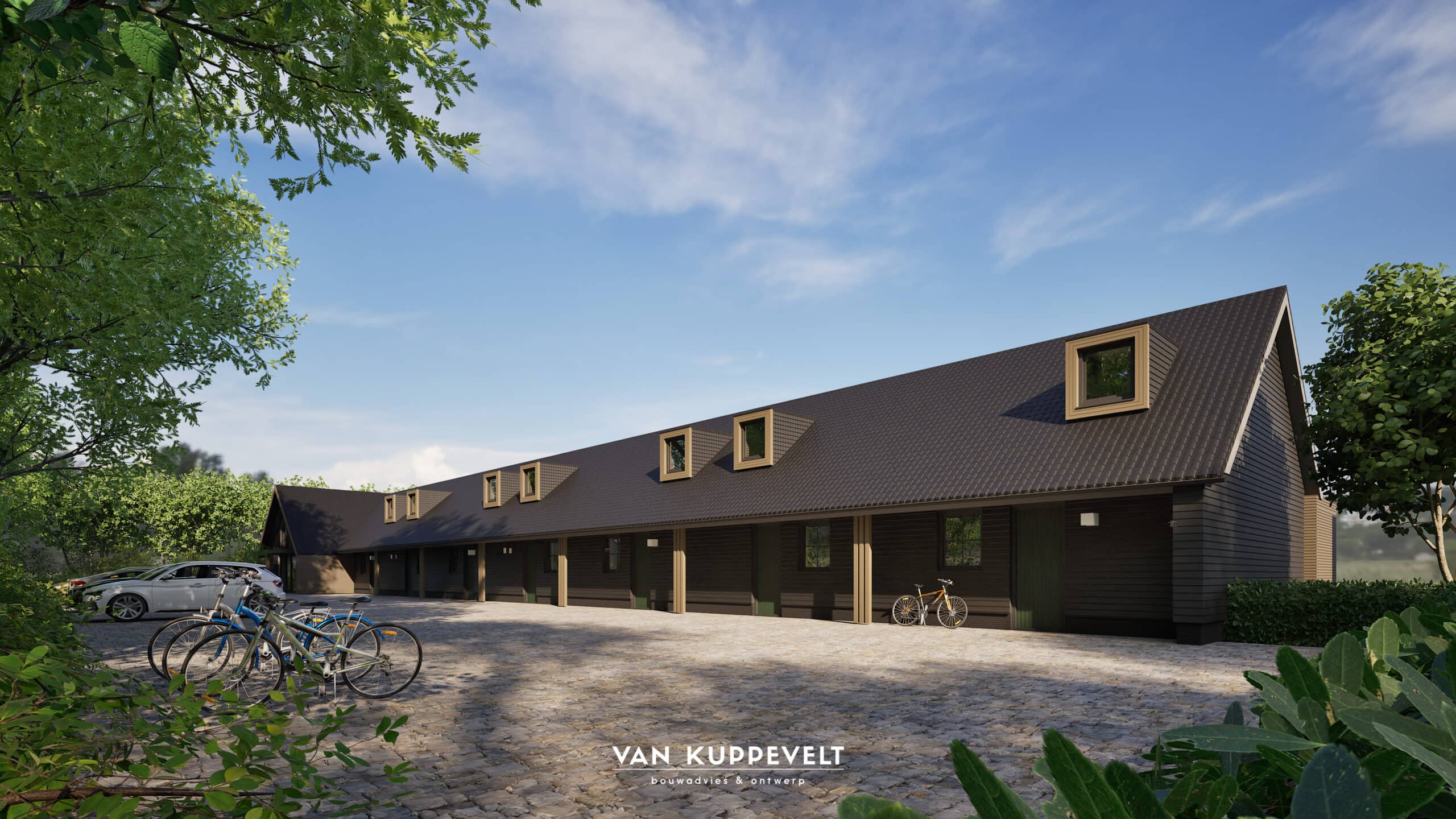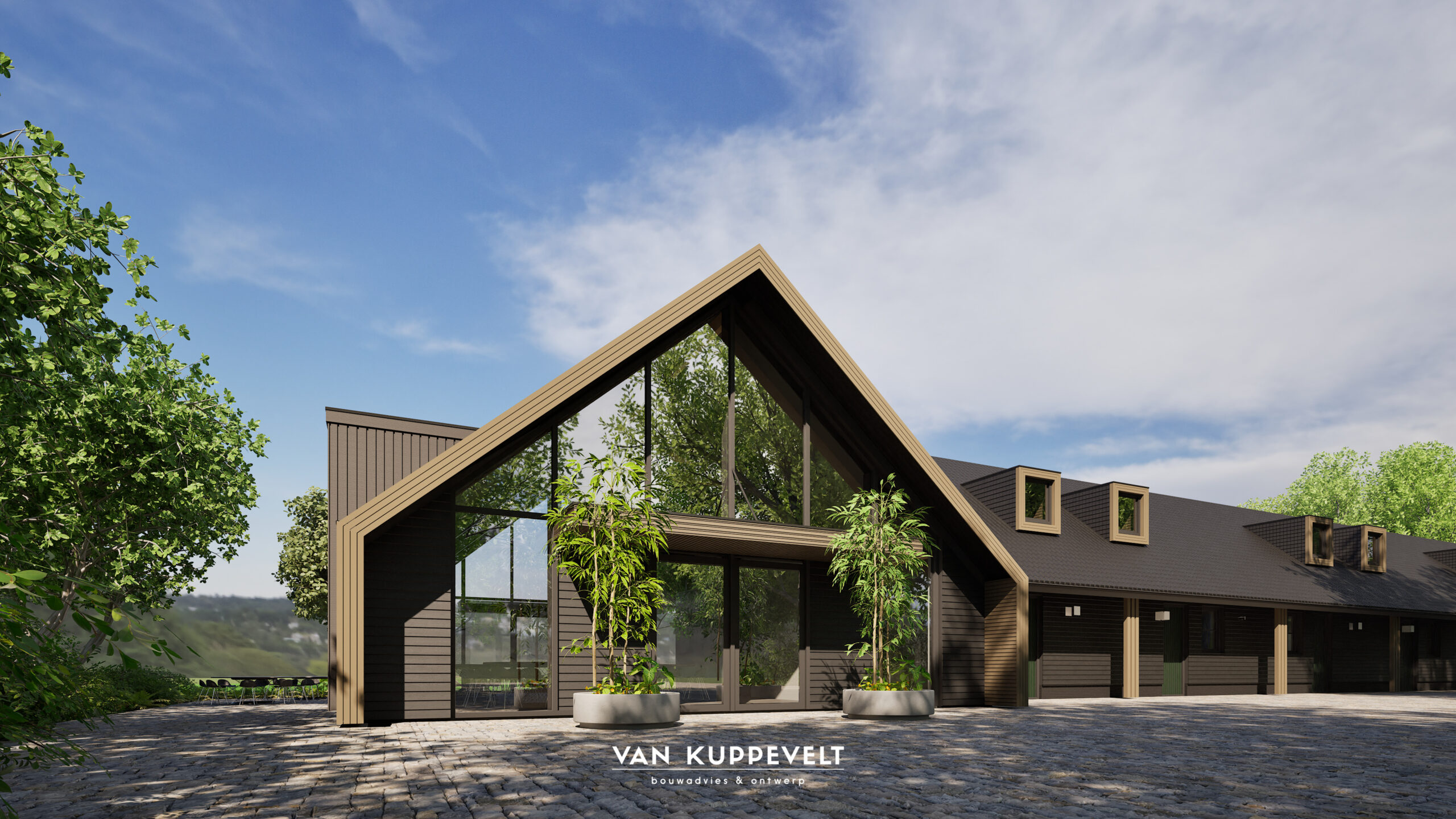 Aan de rand van natuurgebied Reichswald en De Diepen is dit bouwplan ontworpen. Het is de entree van het aangrenzende wandel- en fietsgebied en is gericht op recreatie. Het bouwplan bestaat uit het realiseren van een groepsaccommodatie met recreatie-appartementen (boerenkamers) en een moderne bedrijfswoning. De groepsaccommodatie met recreatie-appartementen is een gebouw met een eenduidige massa welke refereert aan de oude kippenschuur die hier ooit stond. Het gebouw heeft aan de zijde van het natuurgebied een doorlopende luifel- en dakconstructie met een smalle belijning van houten delen. Onder deze luifelconstructie bevinden zich de terrassen van de appartementen. De dwarskap aan de kop is van de groepsaccommodatie en is transparant uitgevoerd in de kopgevels voor een optimaal doorzicht naar het groen. De bedrijfswoning vormt de moderne tegenhanger en heeft rondom uitzicht op het bedrijf en de natuur.